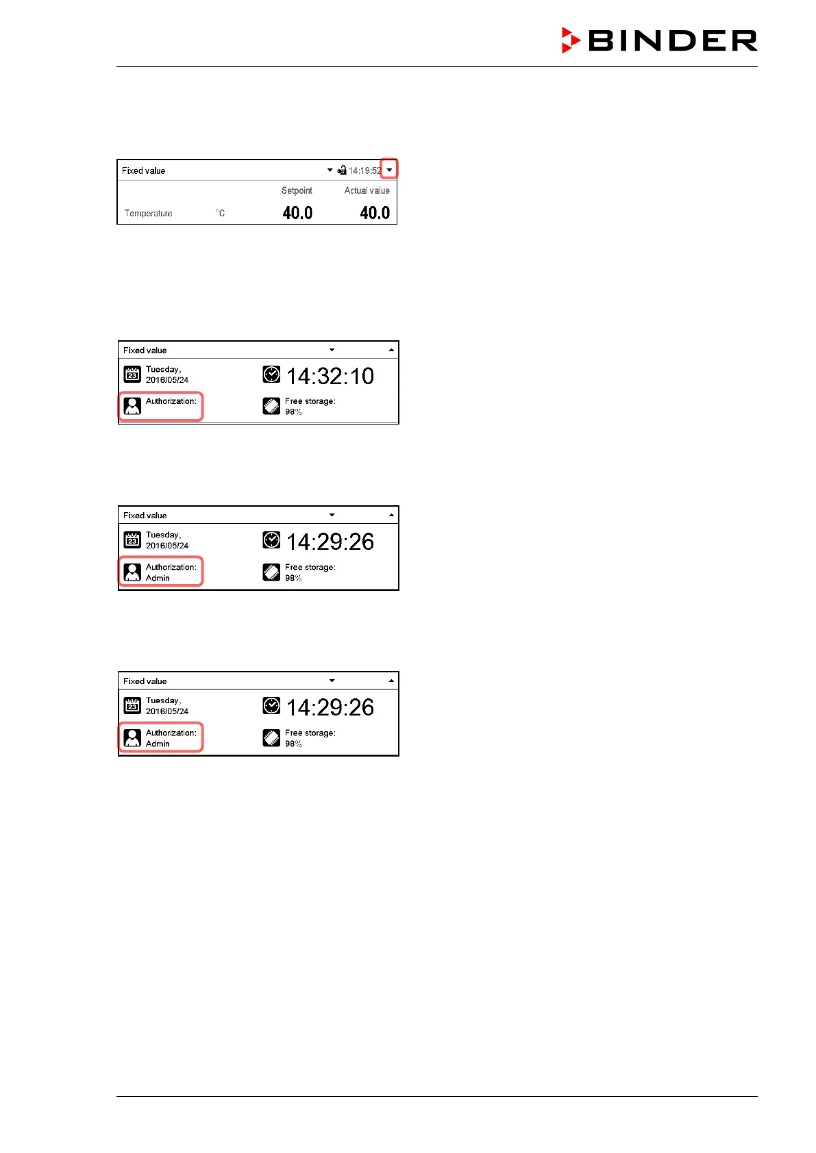 To check the authorization level of the user currently logged-in, select in Normal display the arrow far