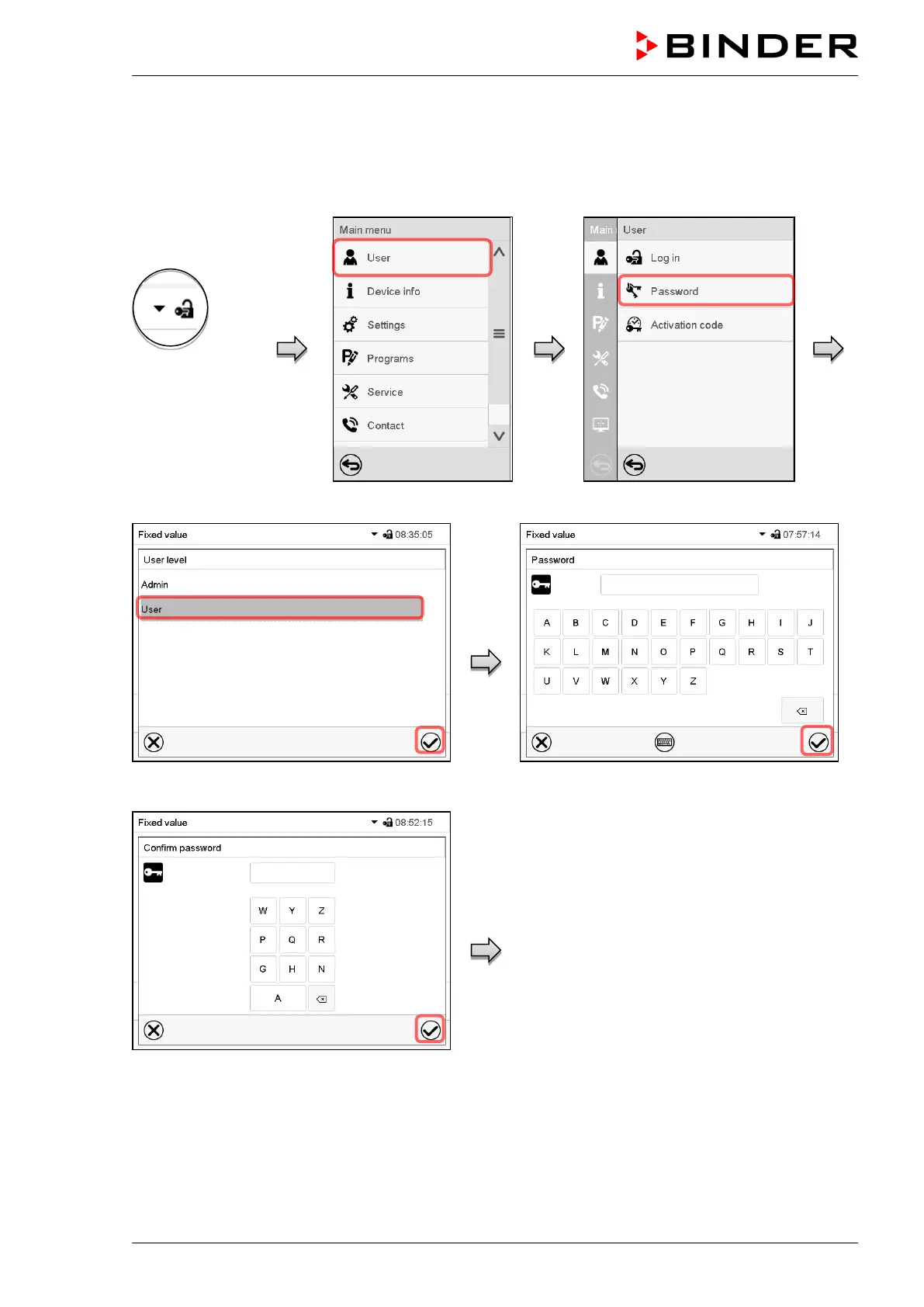 password” screen. Press the Confirm icon.