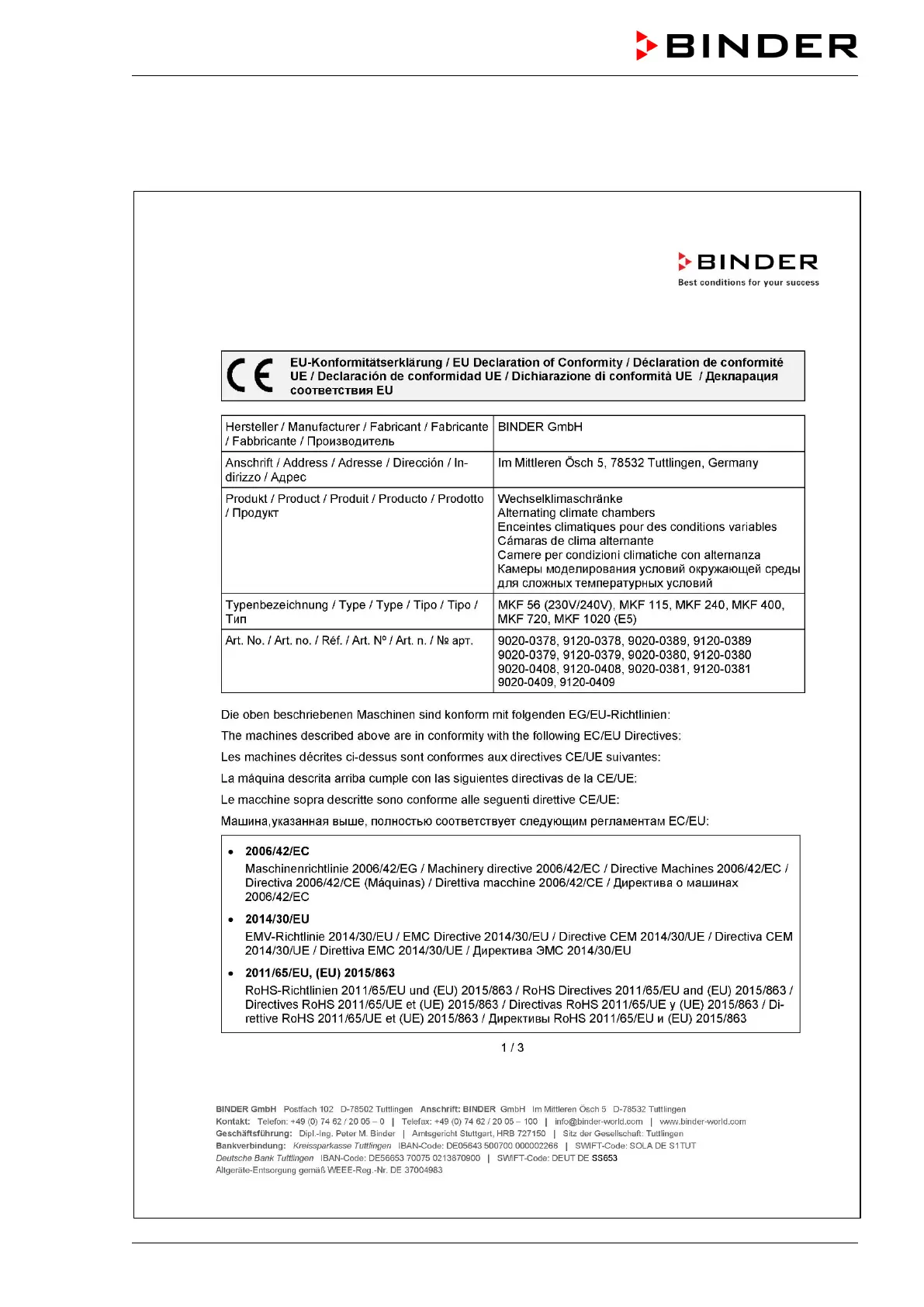 Binder MKF 400 - Certificates and Declarations of Conformity; EU Declaration of Conformity for MKF
