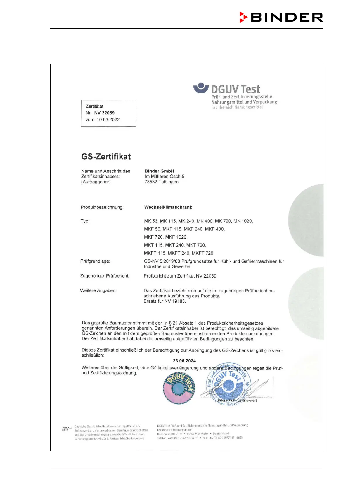Binder MKF 400 - Certificate for the GS Mark of Conformity of the Deutsche Gesetzliche Unfallversicherung E.V. (German Social Accident Insurance) DGUV