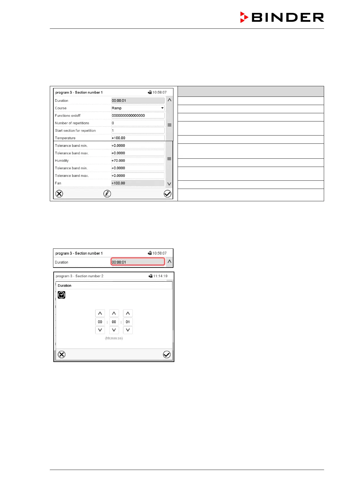 Enter the desired section duration with the arrow keys