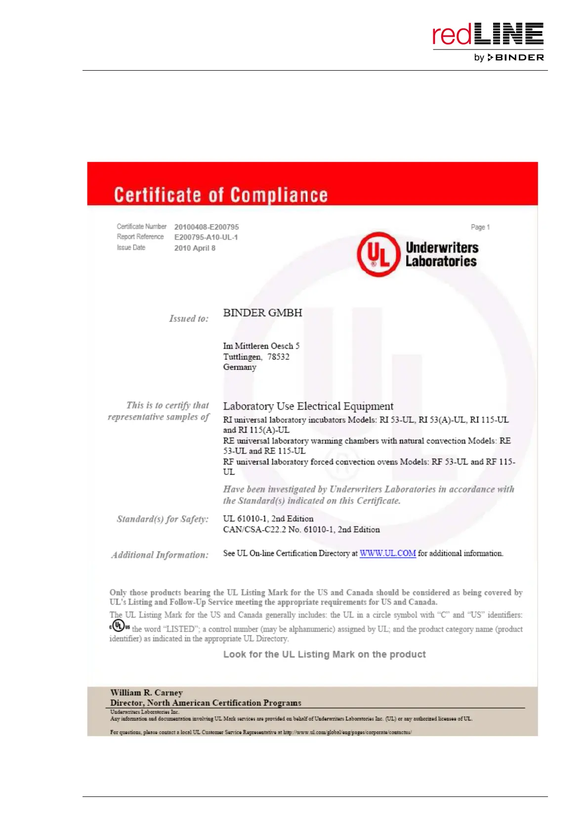 Binder redLINE RE 53 - UL Certificate, Valid for Redline-UL Units