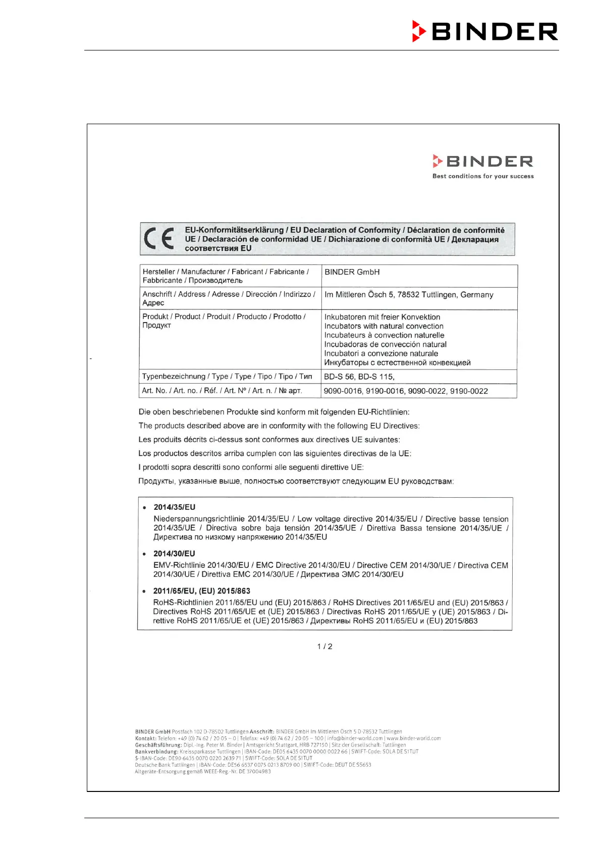 Binder Solid.Line BD-S 56 - Certificates and Declarations of Conformity; EU Declaration of Conformity for BD-S
