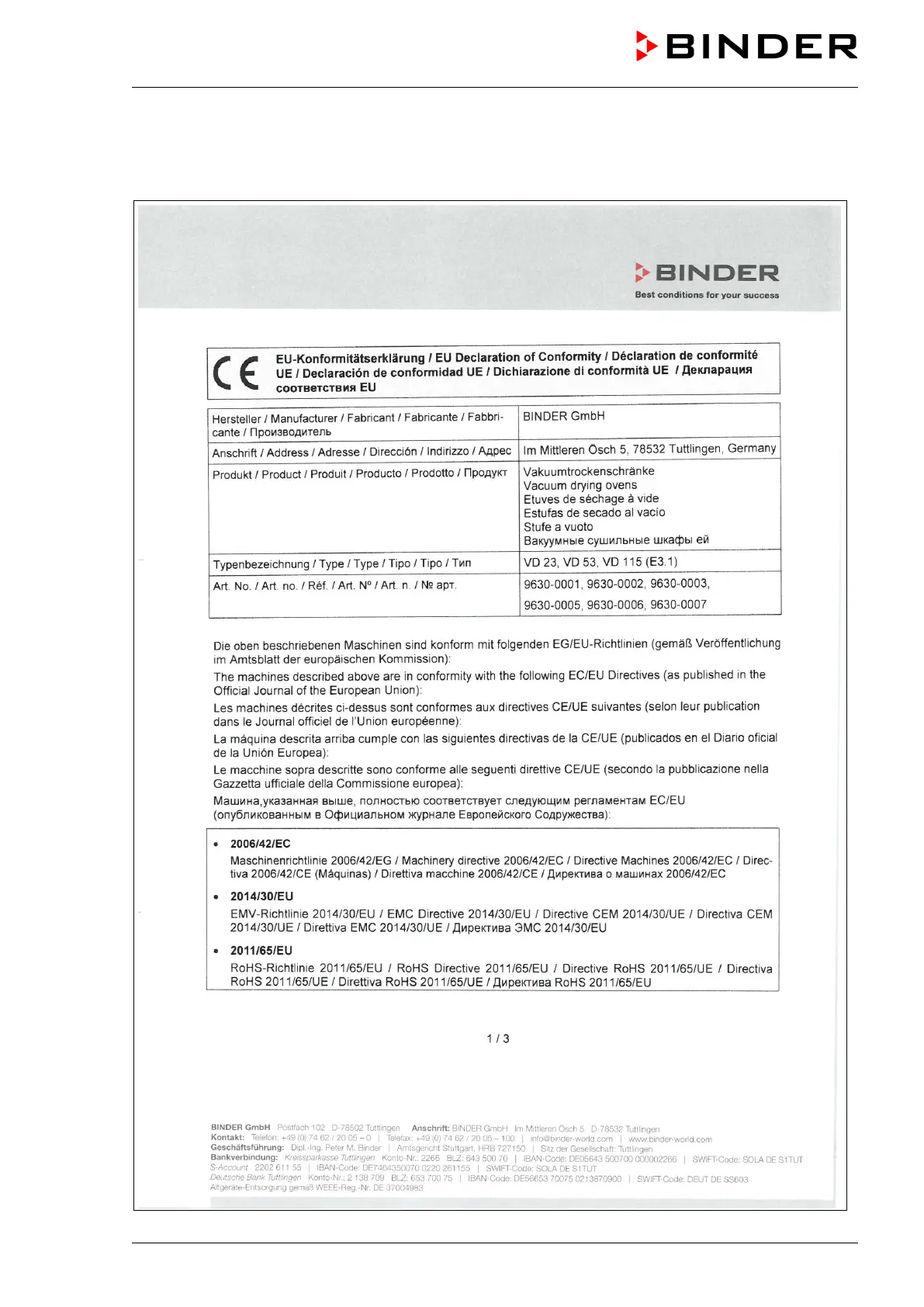 Binder VD 115 - 27 Certificates and Declarations of Conformity; EU Declaration of Conformity