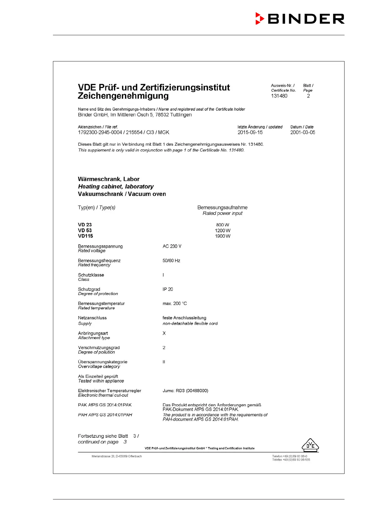 Other manuals for Binder VD 53