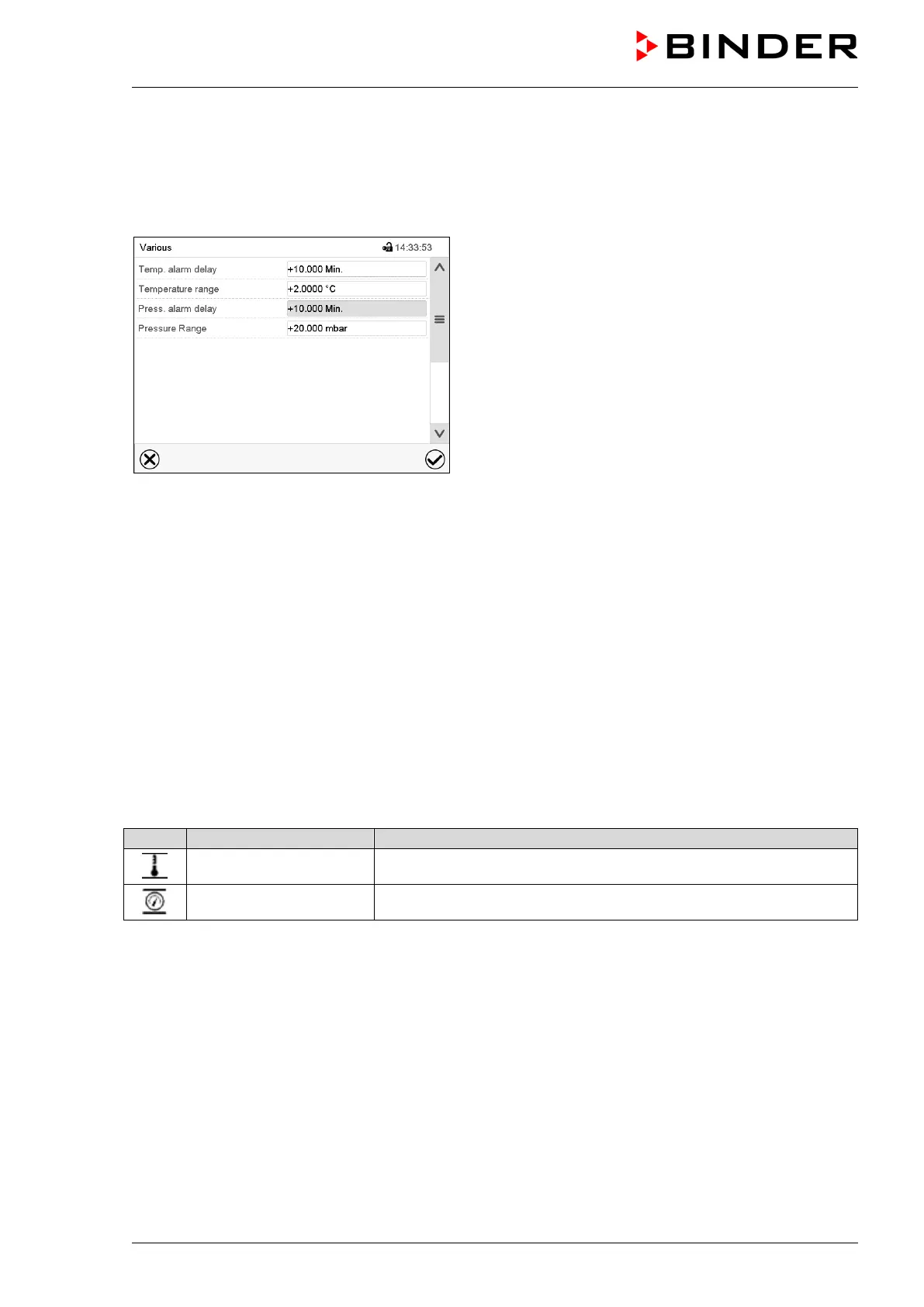 • Select the field “Press. alarm delay” and enter the time in minutes, after which the pressure range