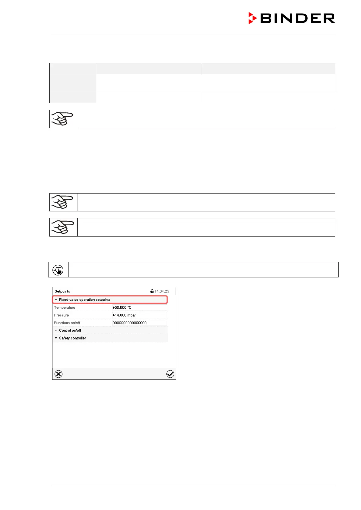 In Fixed value operating mode you can enter a temperature set-point, a pressure set-point, and the swit-