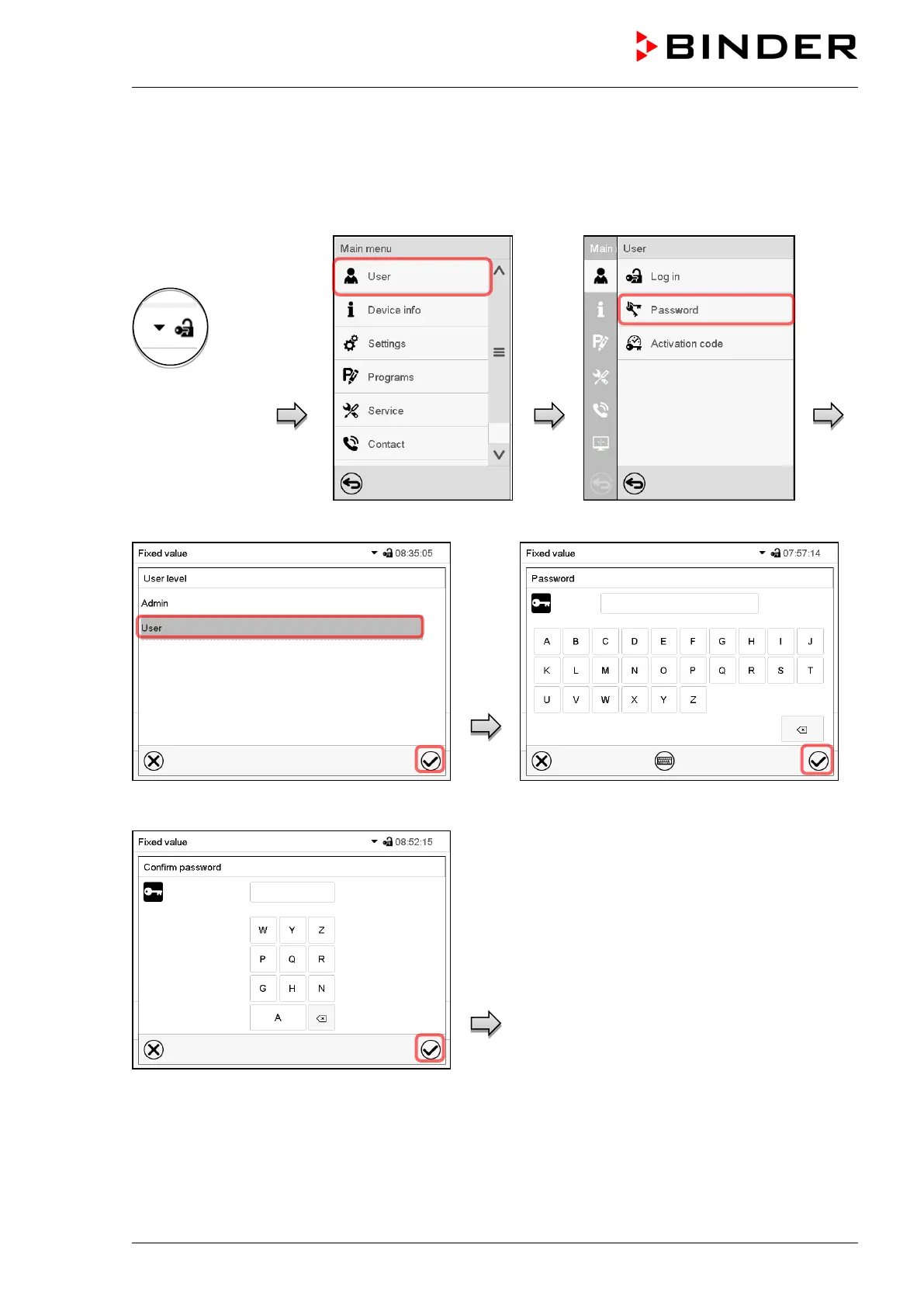 password” screen. Press the Confirm icon.
