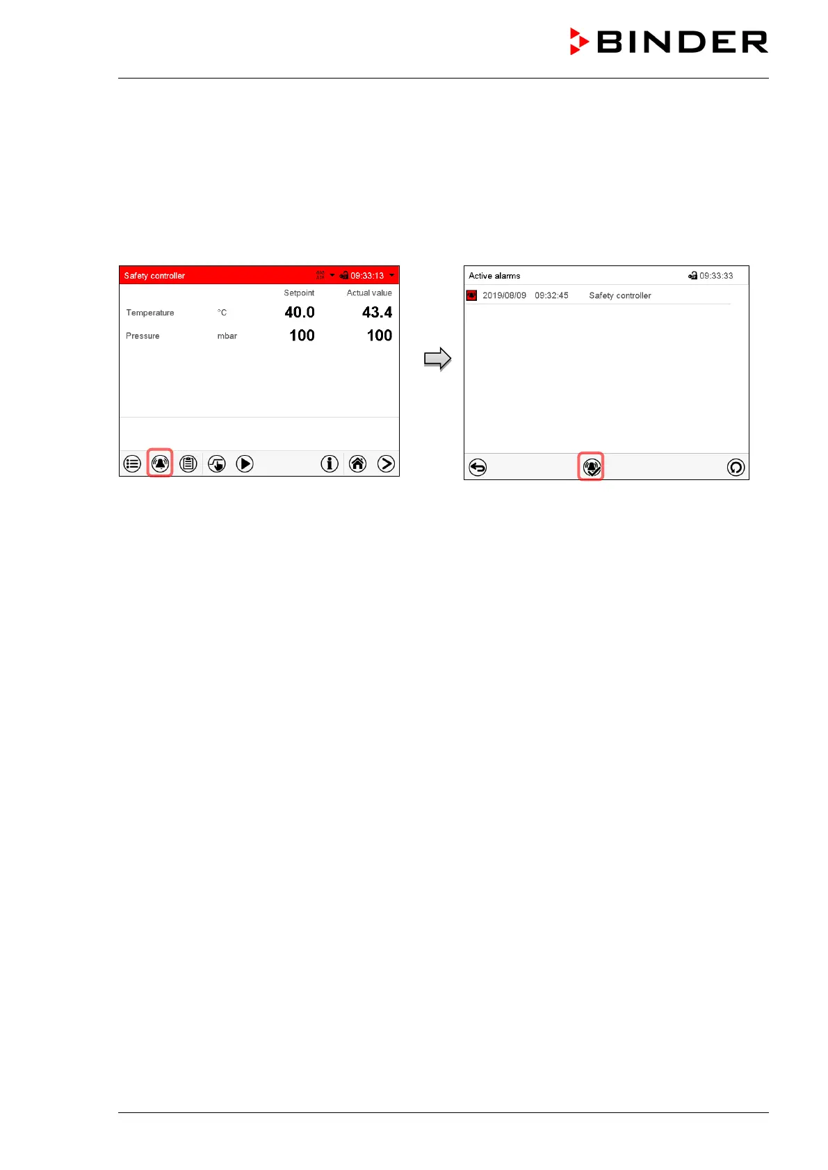 pressing the OK button, the alarm message “Safety controller” and the “Collective alarm” icon are re-