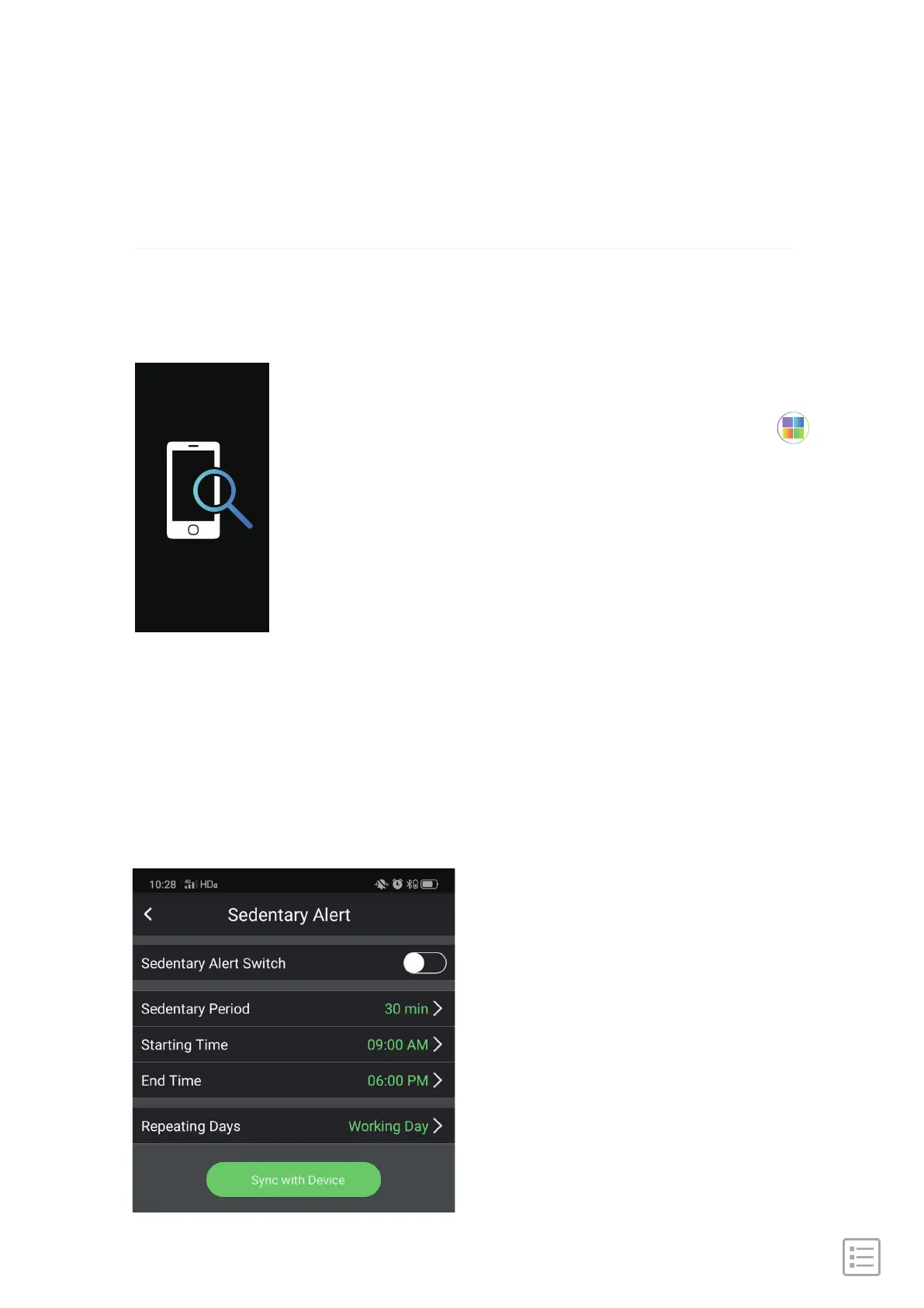 Steps: Settings →Sedentary Alert →Turn on Switch→Set start/ Stop