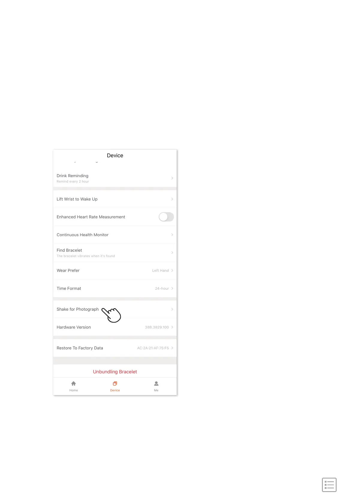 Steps: Open "FitCouldPro" App → Device → Shake for Photo-