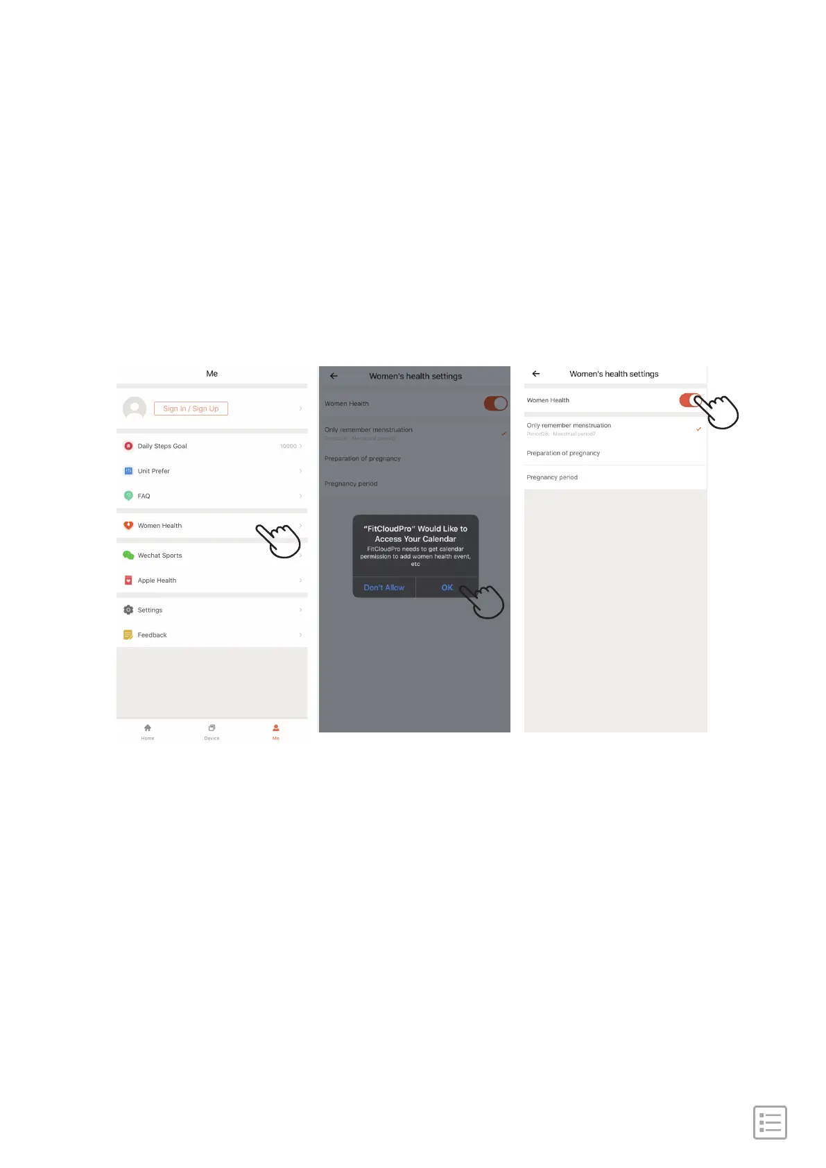 Go to "FitCouldPro" APP→Me→Women Health→Allow the the