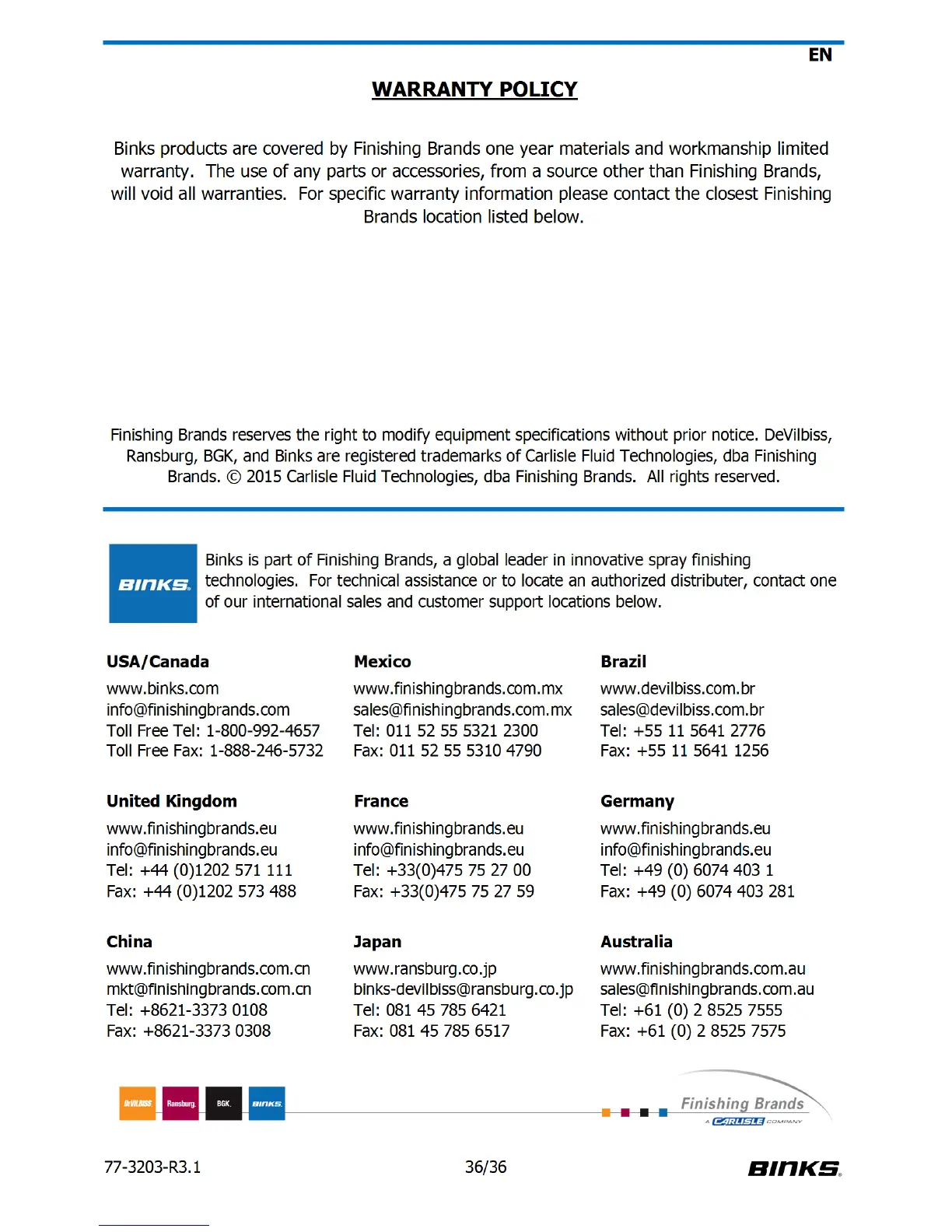 Binks products are covered by Finishing Brands one year materials and workmanship limited