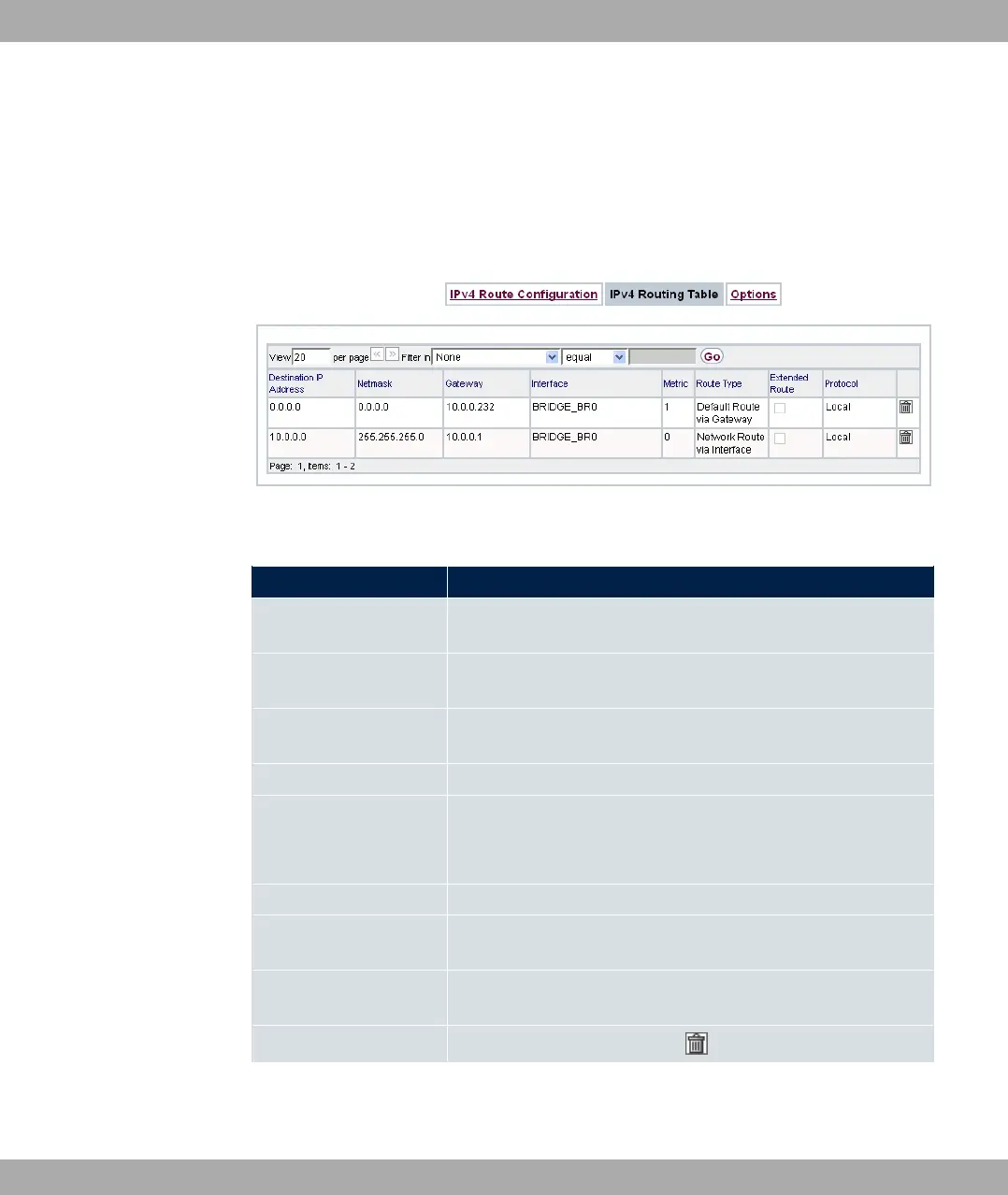 Fields in the menu IPv4 Routing Table