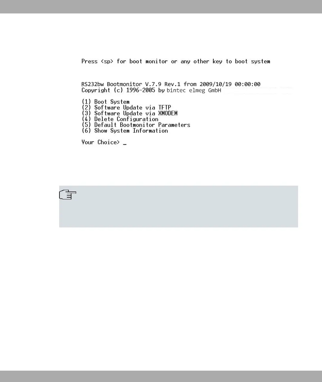 the functions of the BOOTmonitor. If you do not make an entry within four seconds, the