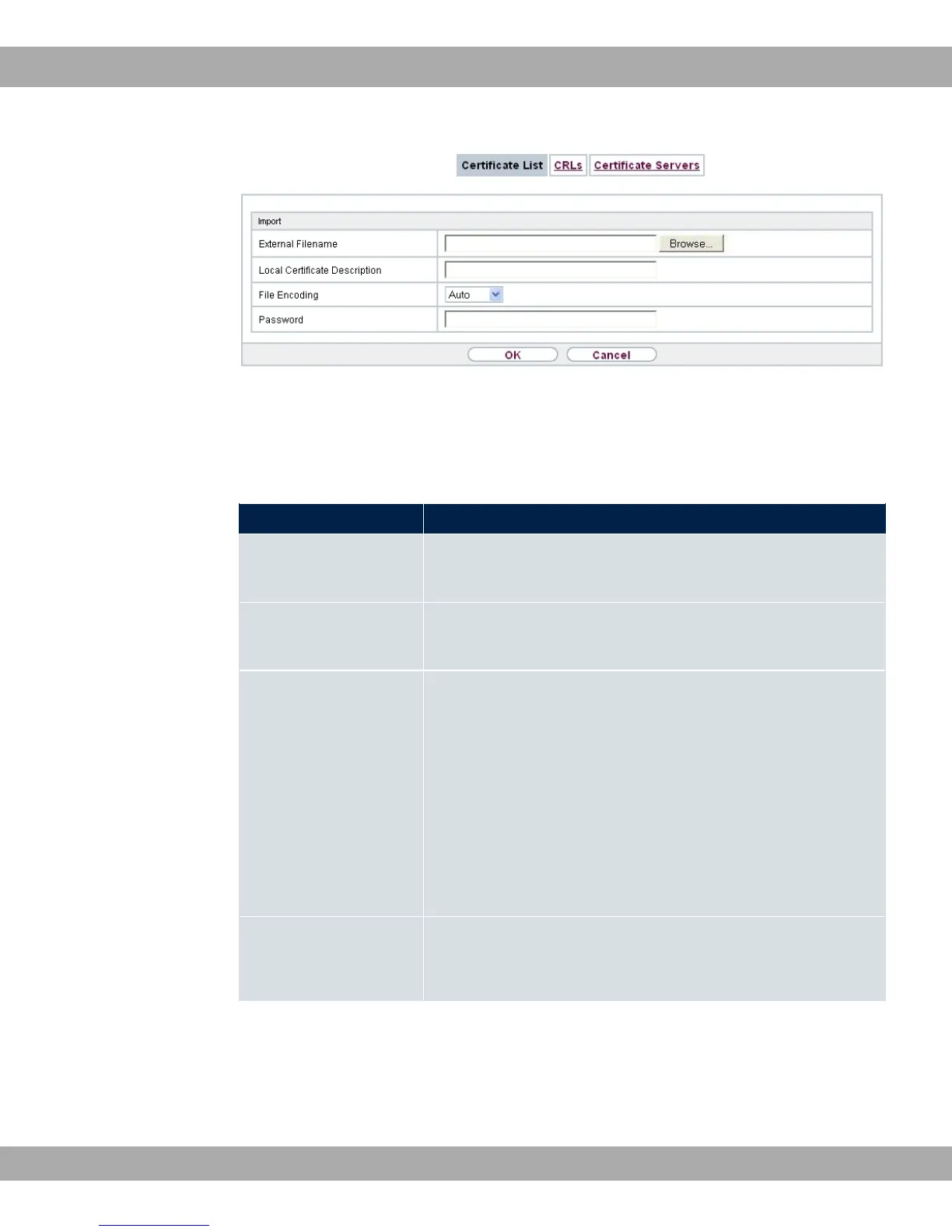 External Filename Enter the file path and name of the certificate to be imported, or