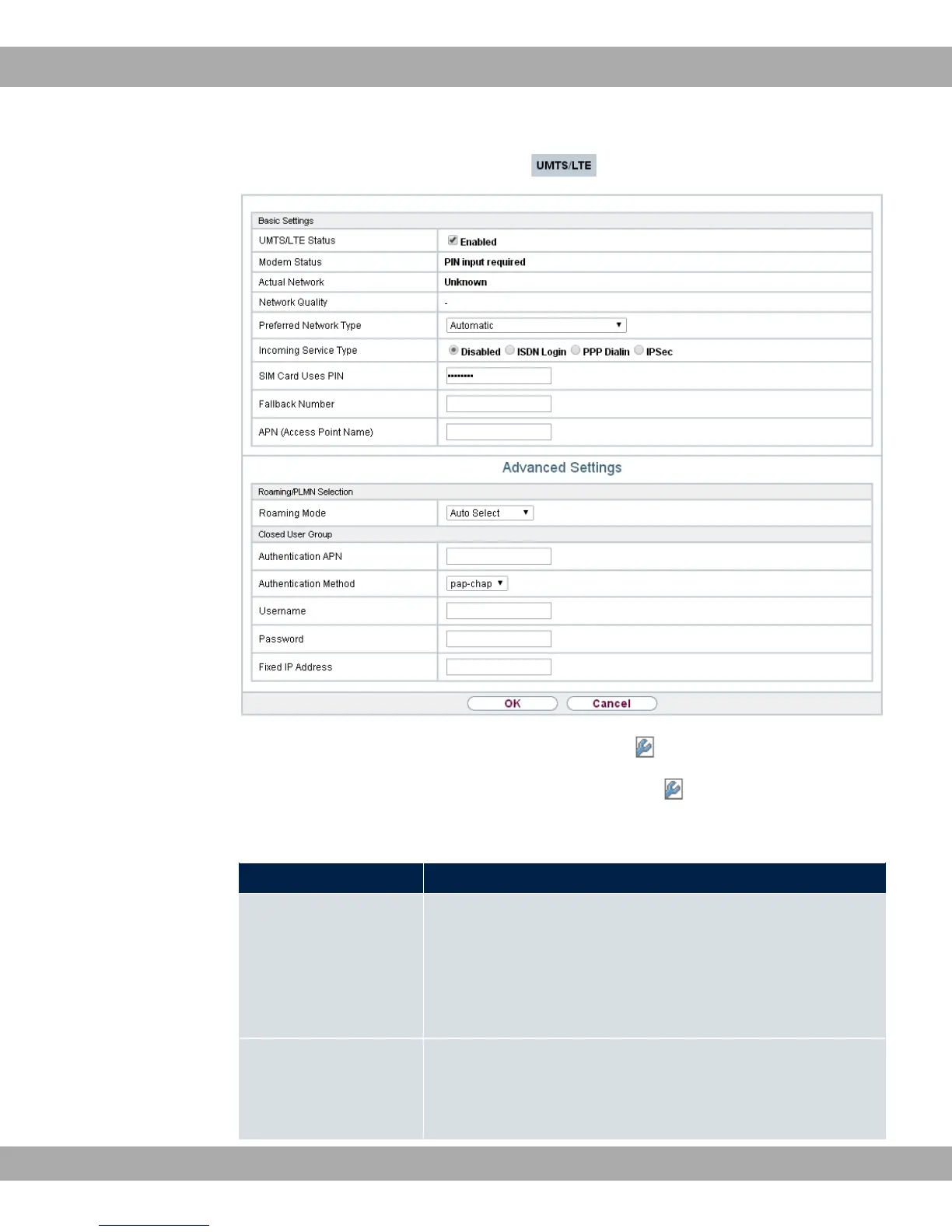 UMTS/LTE Status Select whether the chosen UMTS/LTE modem should be en-
