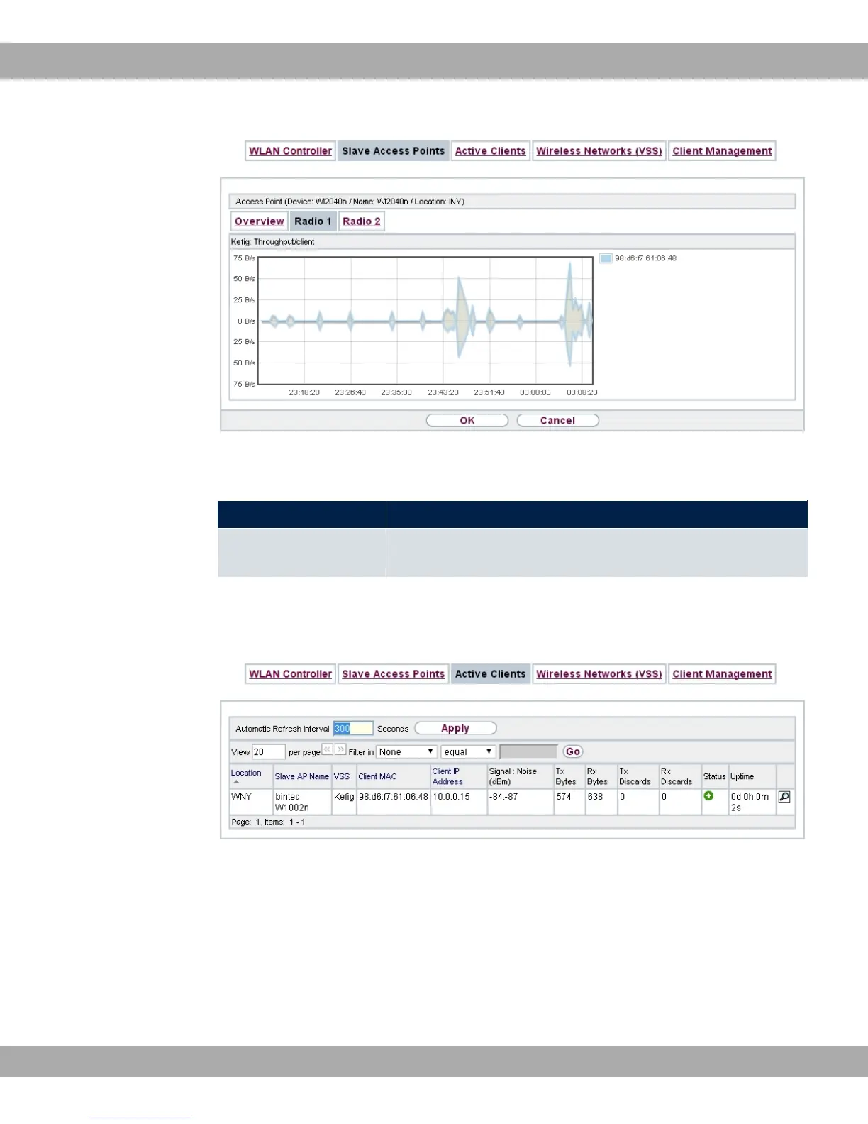 Throughput/client Displays the received and transmitted data traffic per client over