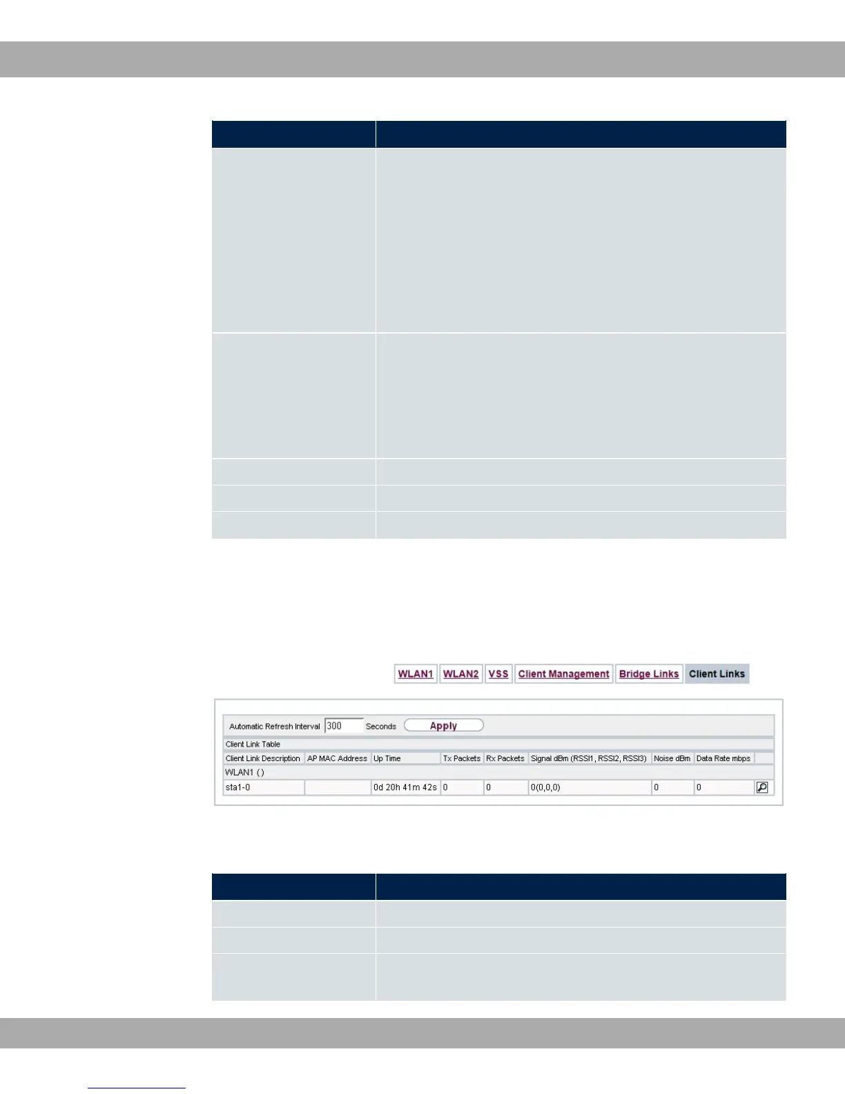 In the Monitoring->WLAN->Client Links menu, current values and activities of the con-