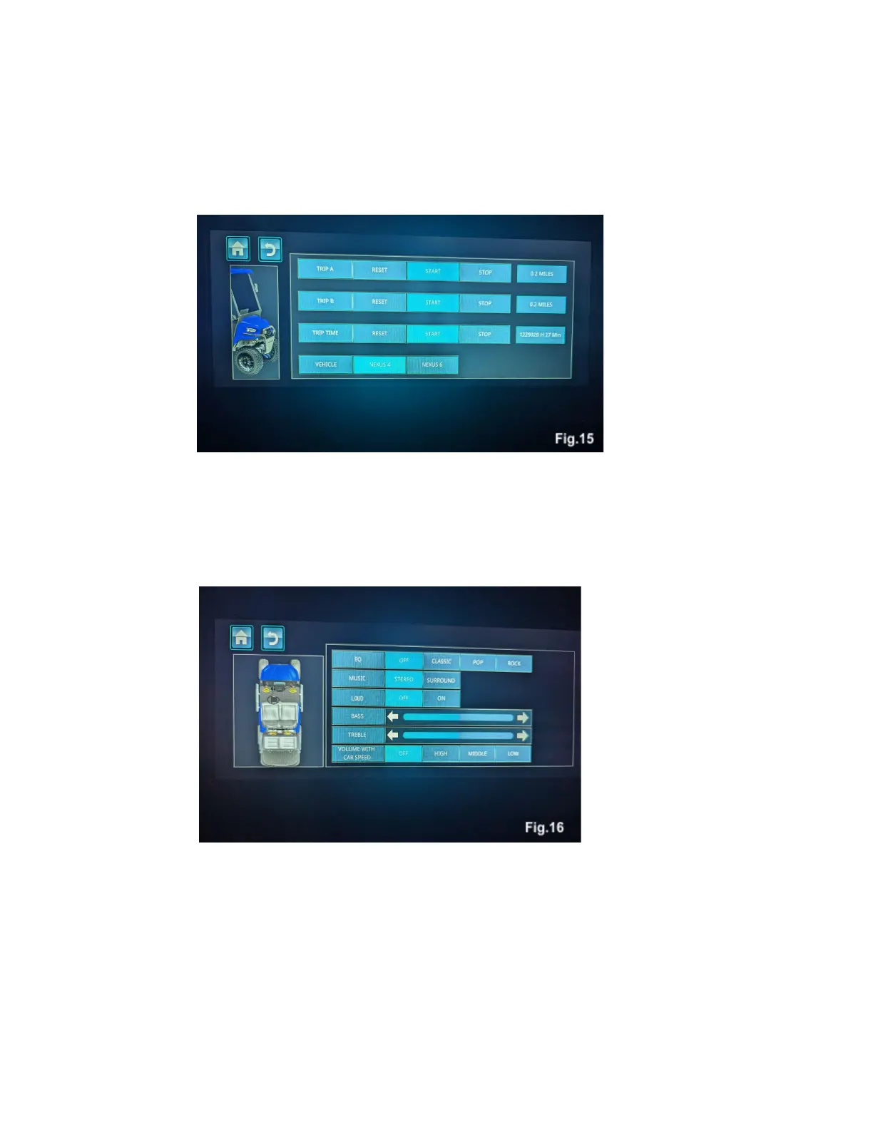 Touching the vehicle icon on will display a screen will bring up a menu with options for resetting trip
