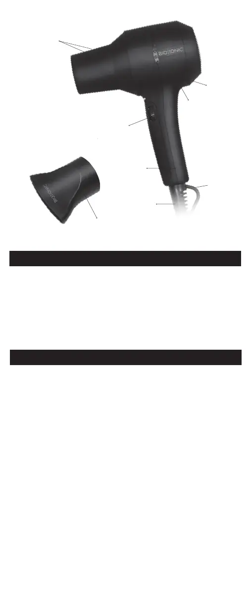 Nunca enrolle el cordón en el secador. Permita que el cable cuelgue