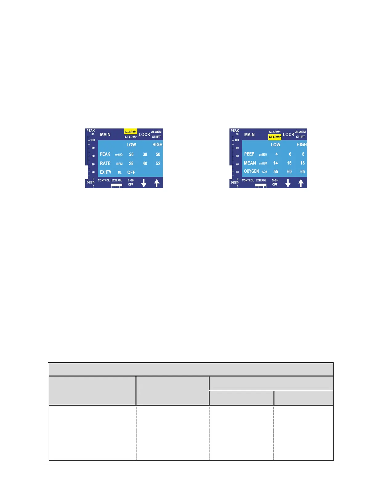 SECONDARY ALARM MENU (ALARM2)- monitored parameters and alarms- PEEP and CPAP, Mean