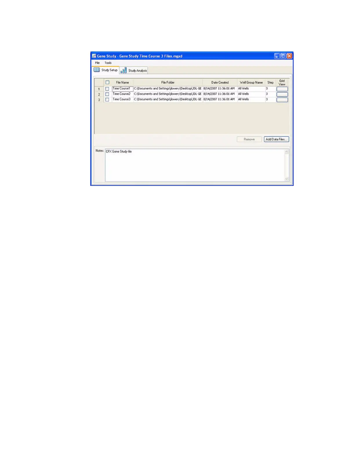 window. To quickly add experiments to a Gene Study, drag the data files (.pcrd