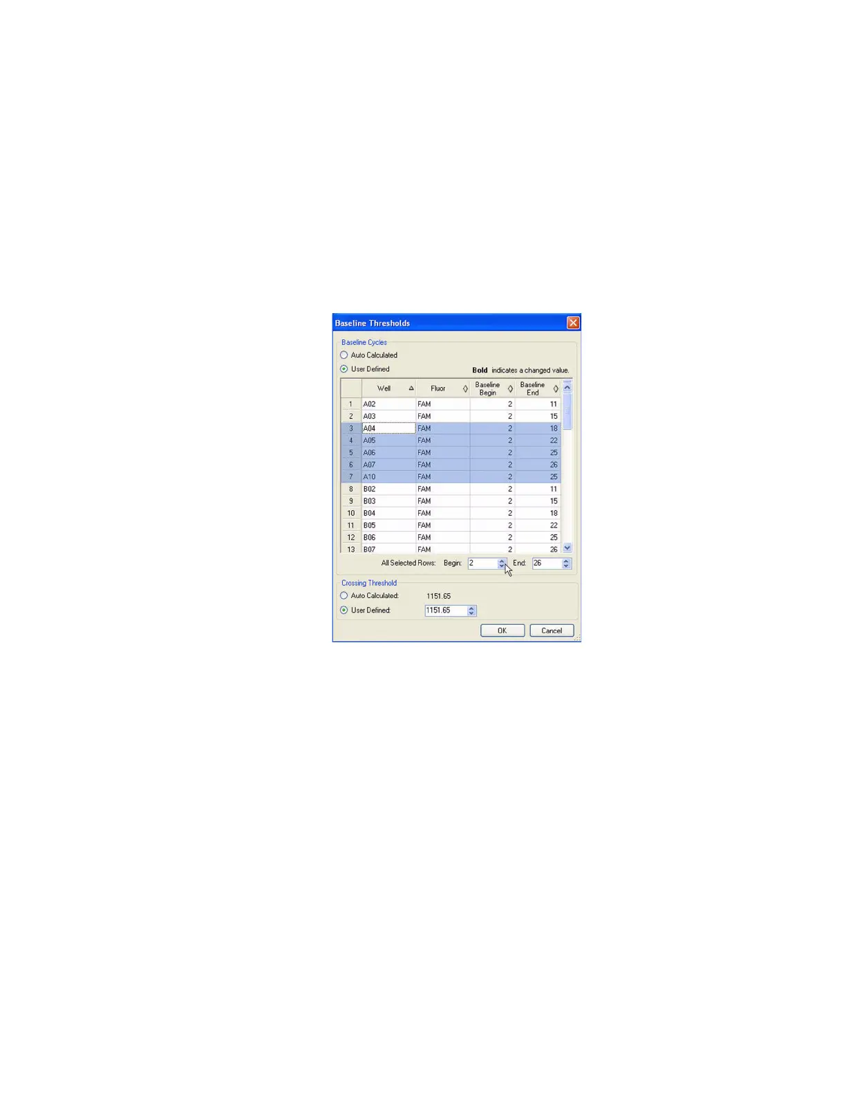 2. Adjust the Baseline Begin cycle and Baseline End cycle for all selected wells or change