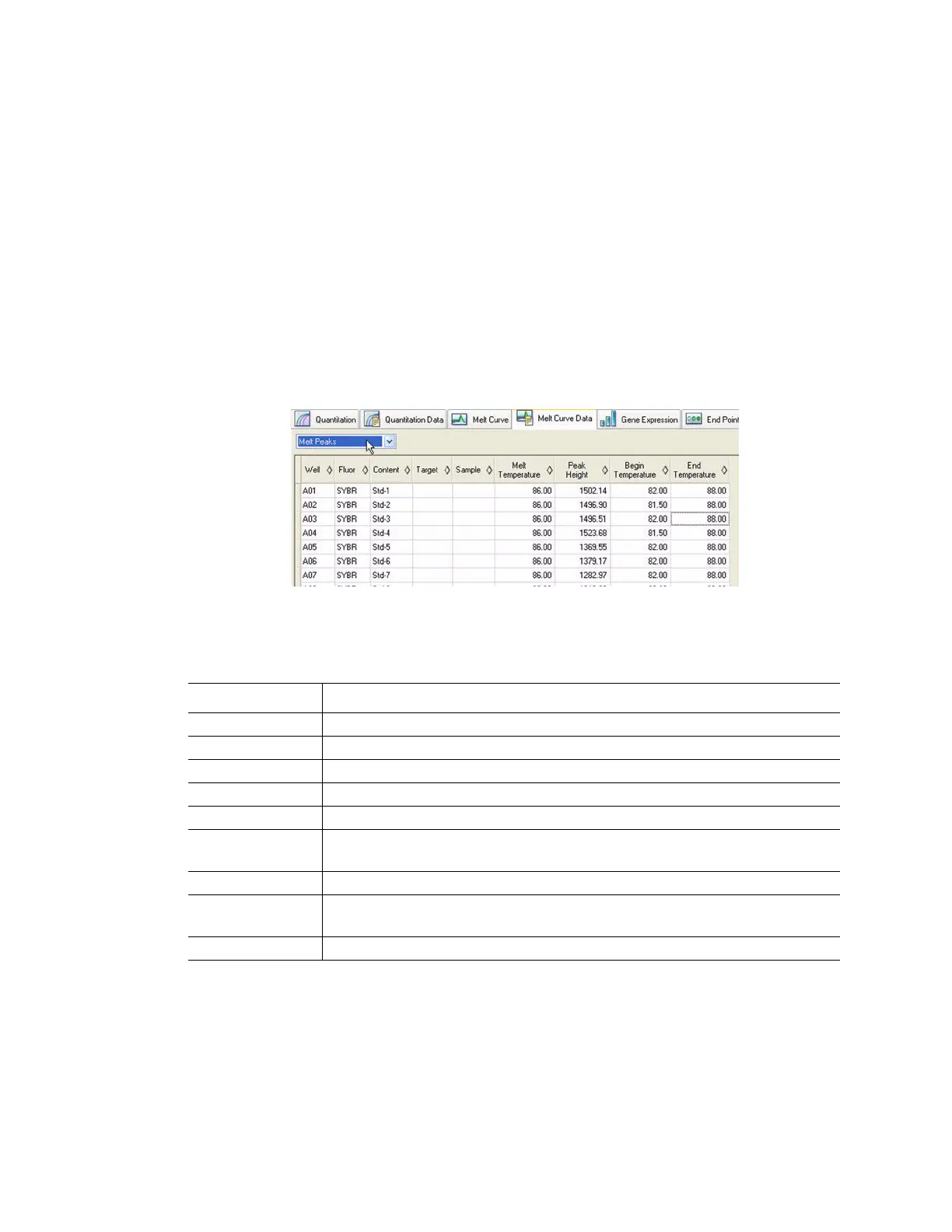 The Melt Peaks spreadsheet (Figure 89) includes the type of information shown in Table 30.
