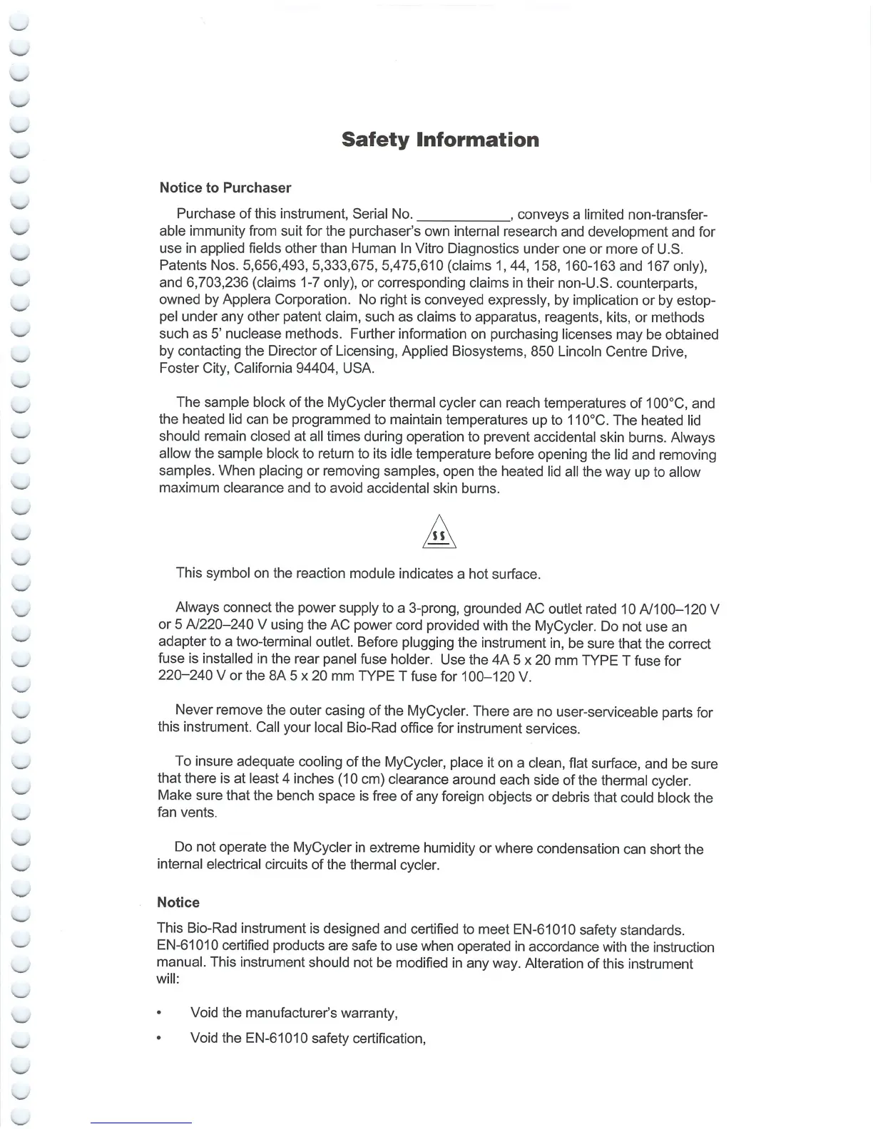 BIO RAD MyCycler - Safety Information; Notice to Purchaser; General Safety Precautions; Electrical and Installation Safety
