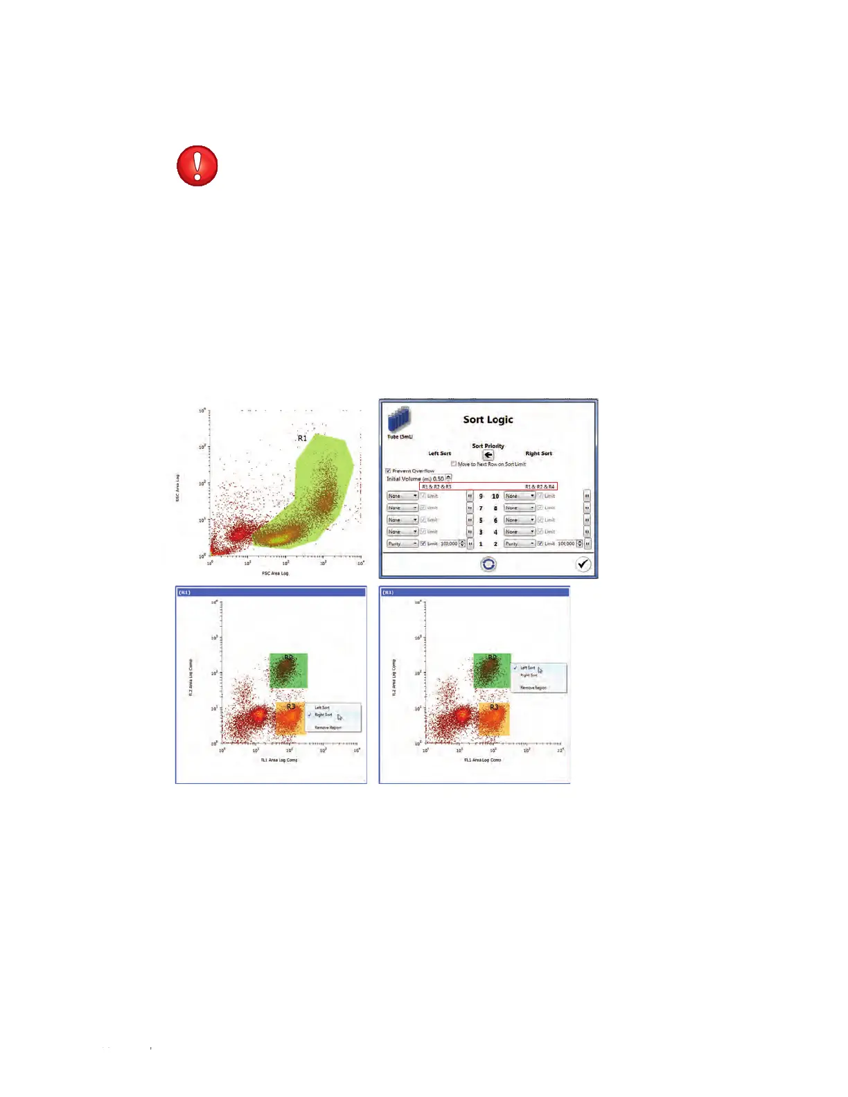 Regions and gates in the histograms and dot plots are used to create sort logic. Multiple