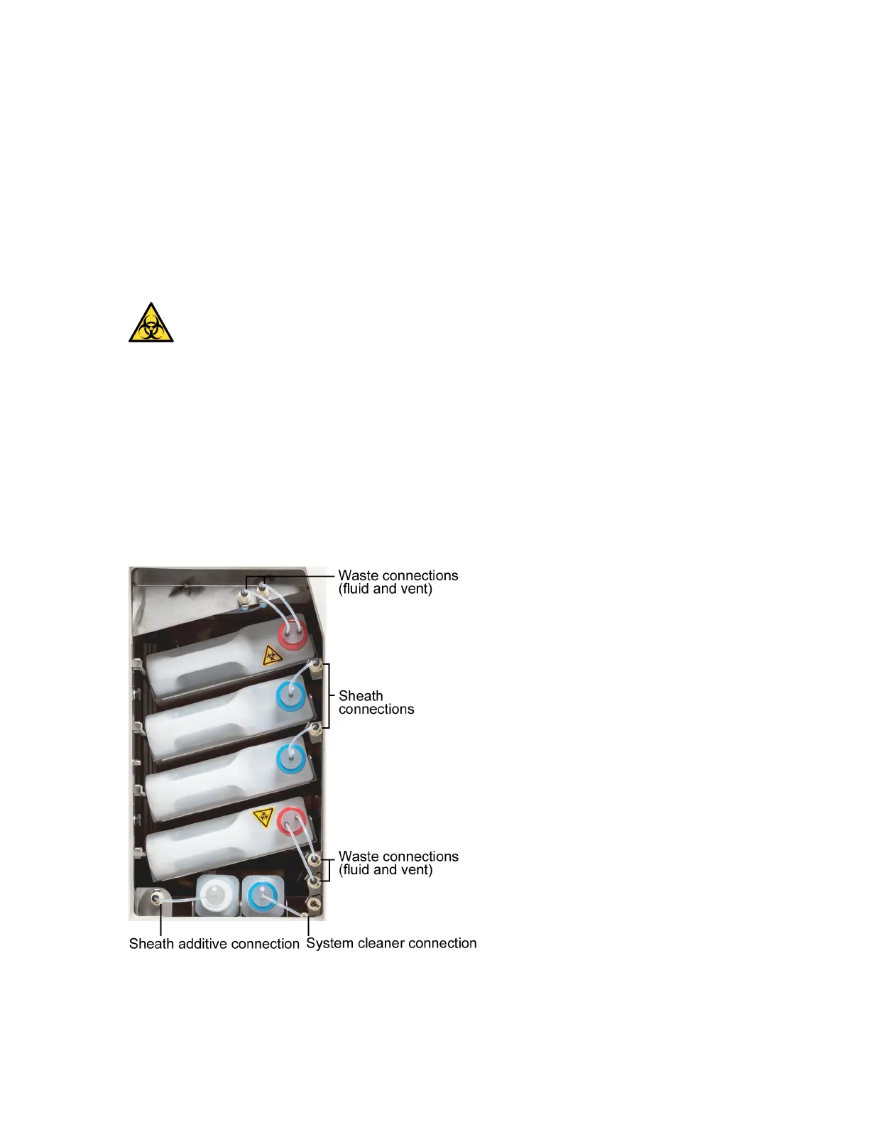 The waste bottles receive the system fluid after it has run through the flow cell and waste lines. The