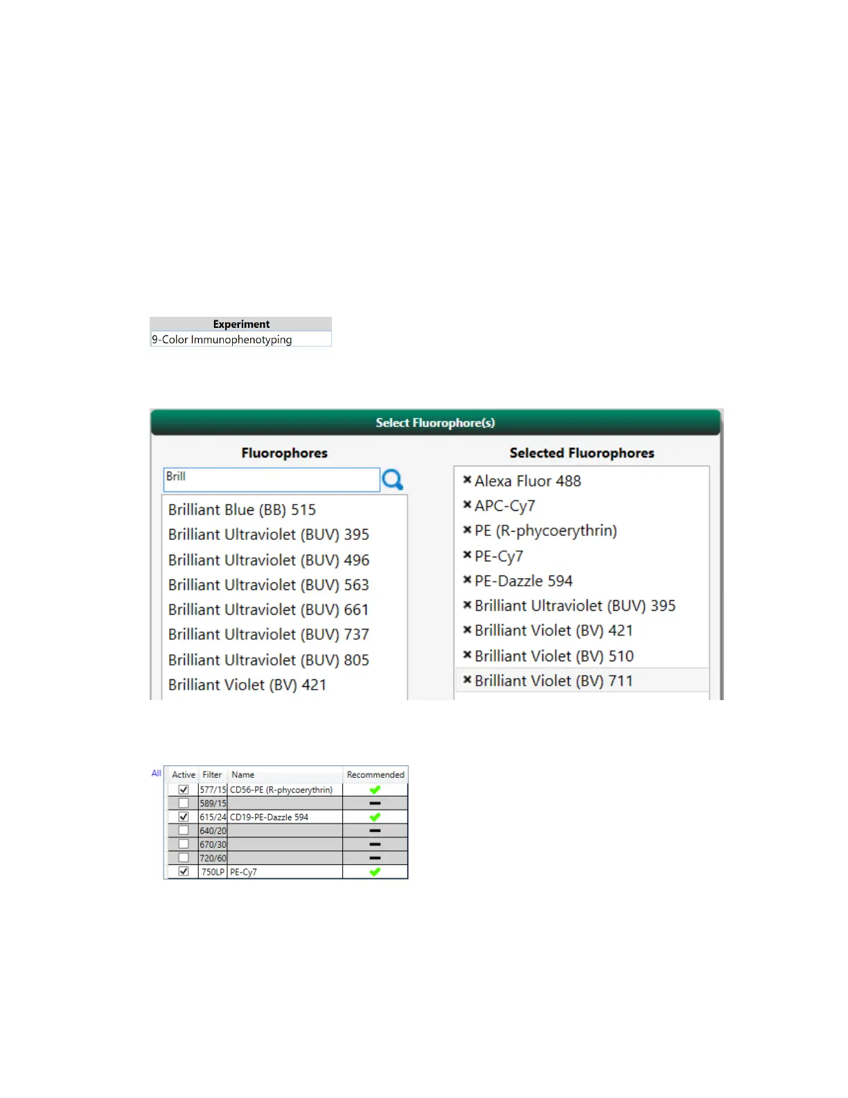 3. In the Selected Fluorophores pannel, double-click fluorophore names in the Fluorophores list to
