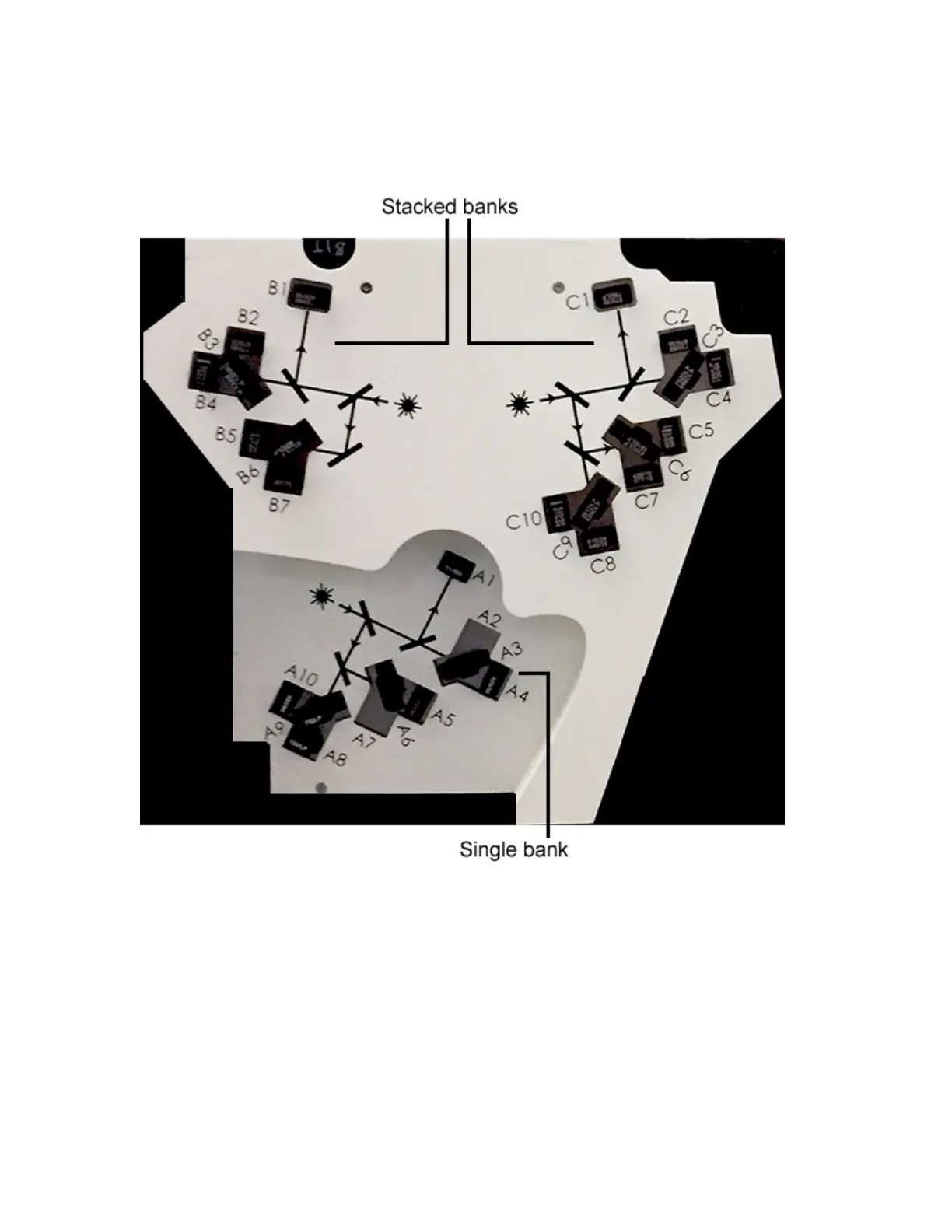 components. Each bank contains an initial array of fixed dichroic mirrors followed by replaceable
