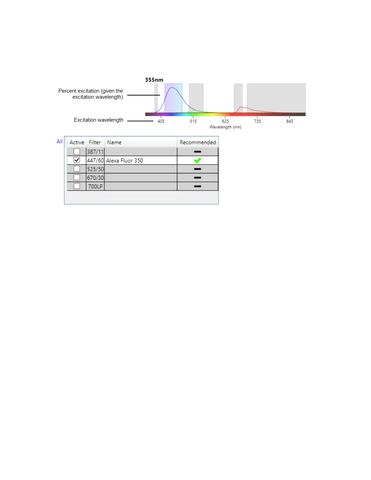 When you add a fluorophore to the Selected Fluorophores list, Everest Software activates a