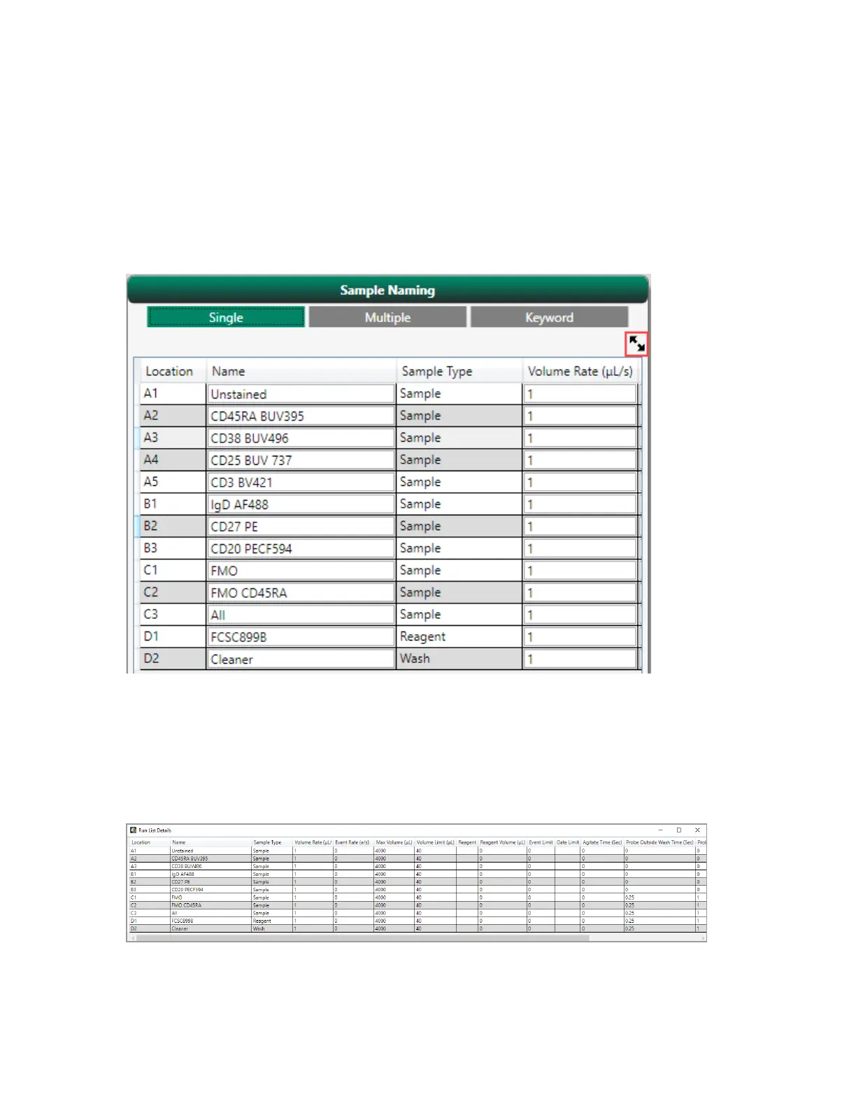 In addition to Location, Name, and Sample Type, the expanded run list shows the following
