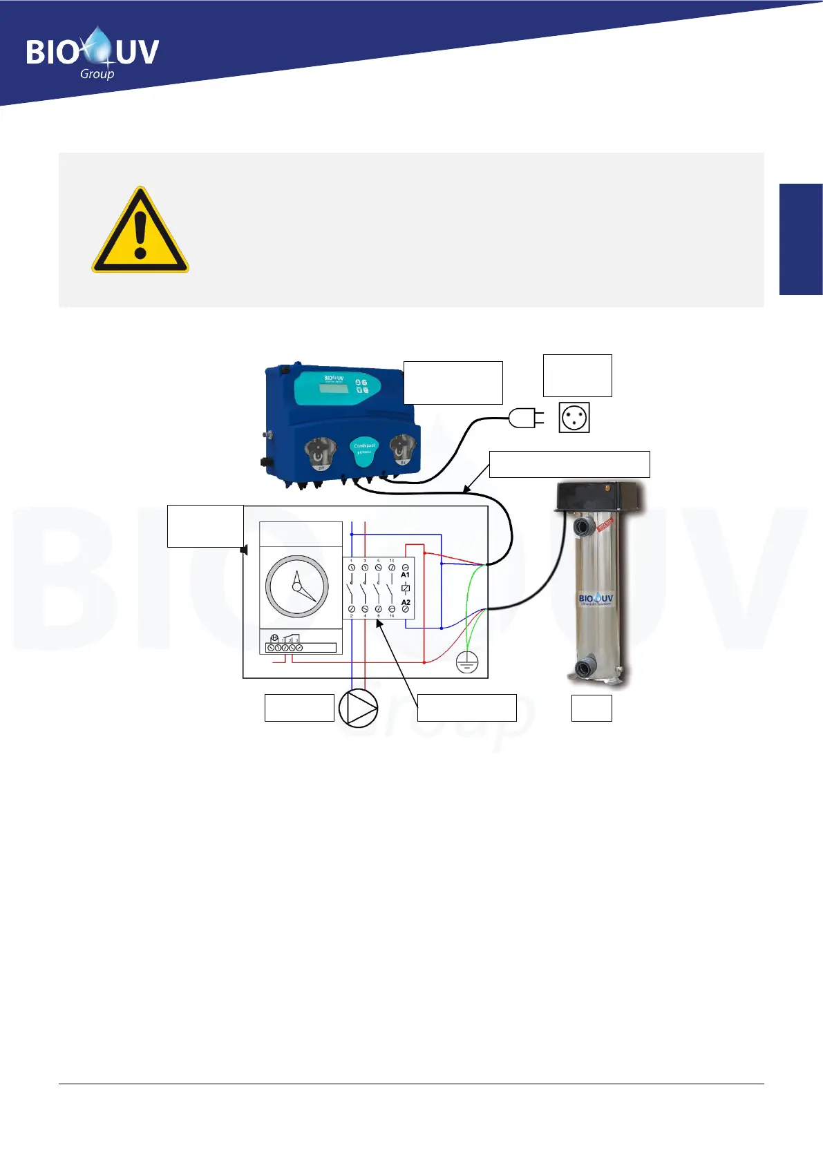 1. Connect the dosing pump to the filtration box as indicated here below (coil of the pump contactor in 220V):
