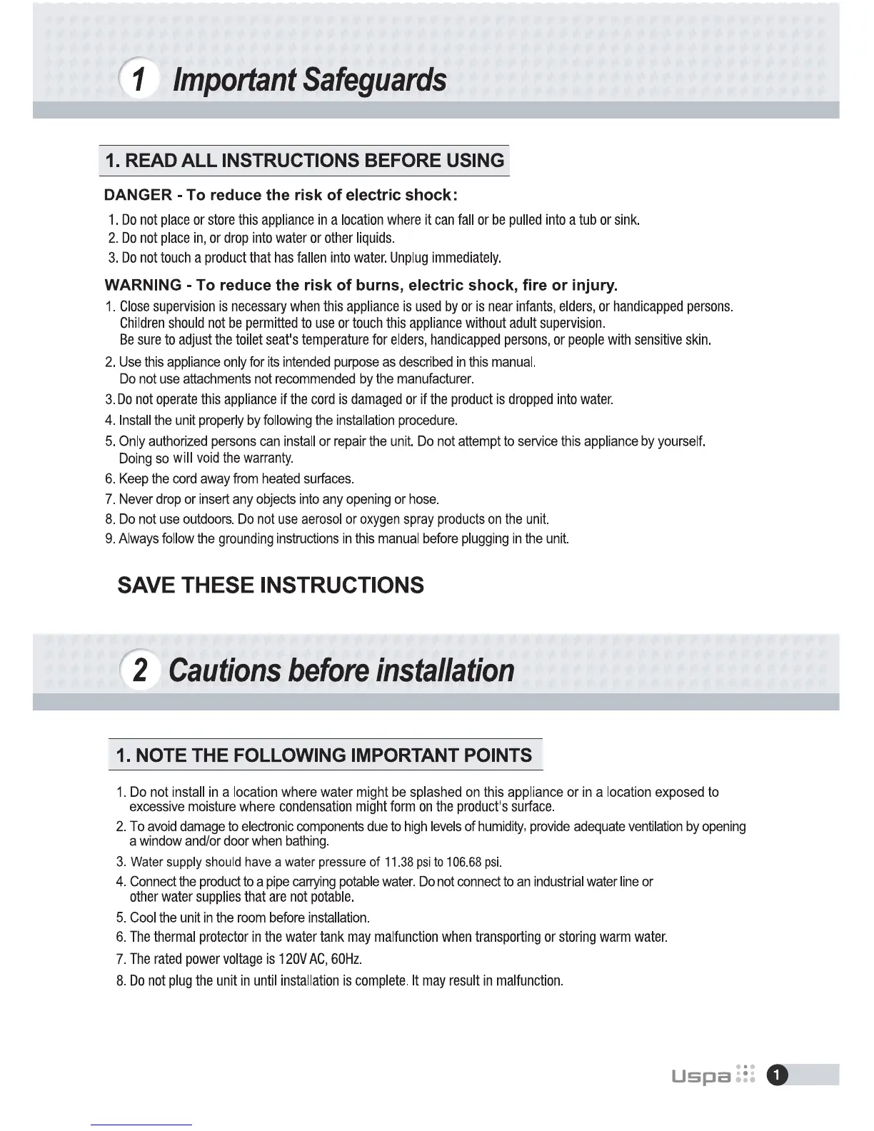 bioBidet BB-600 - Important Safeguards; READ ALL INSTRUCTIONS BEFORE USING; DANGER - Electric Shock Precautions; WARNING - General Safety Precautions