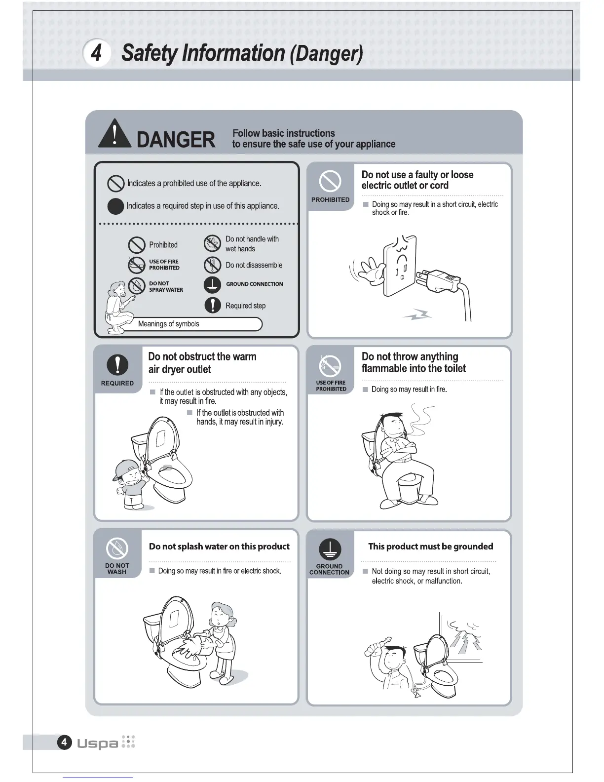 bioBidet BB-600 - Safety Information (Danger); DANGER - Electric Shock and Water Hazards; Prohibited Uses and Required Steps