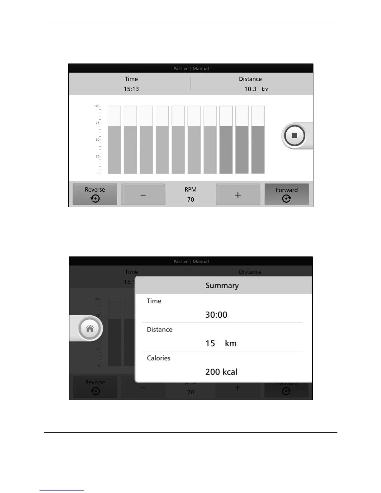 user is exercising, press +/- to adjust rpm level or <Reverse> or <Forward> to change pedaling