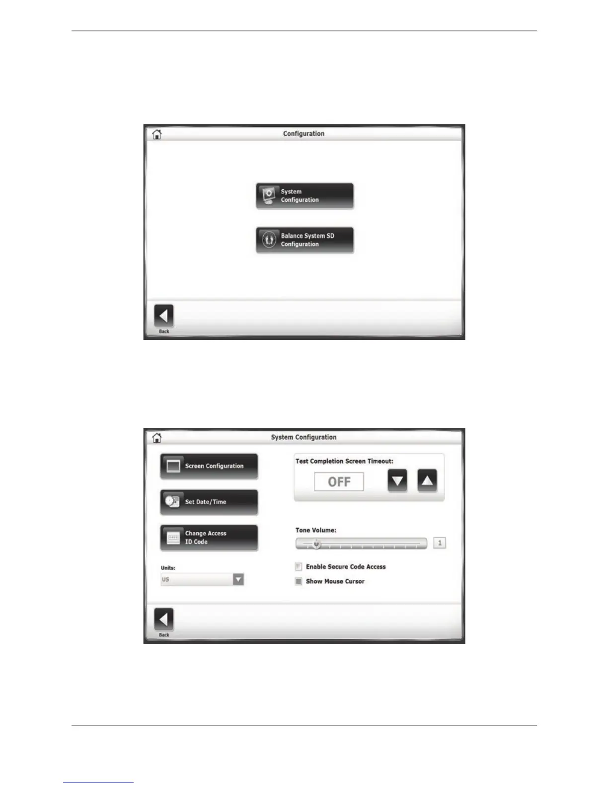 To advance to the Configuration screen from the Utilities Menu, touch <Configuration>. A