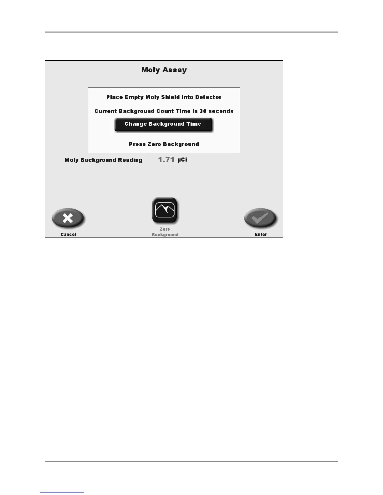 the time that you desire and select <Enter>. The Moly Assay Background Counting screen will