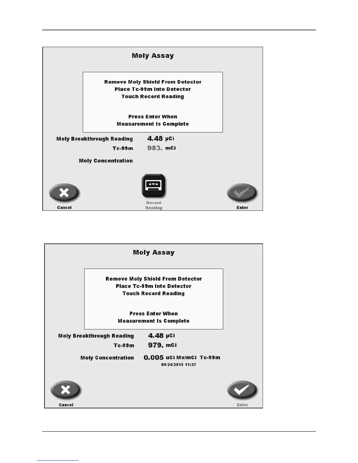 The Moly Assay reading screen showing the Tc-99m and Moly Assay activity along with
