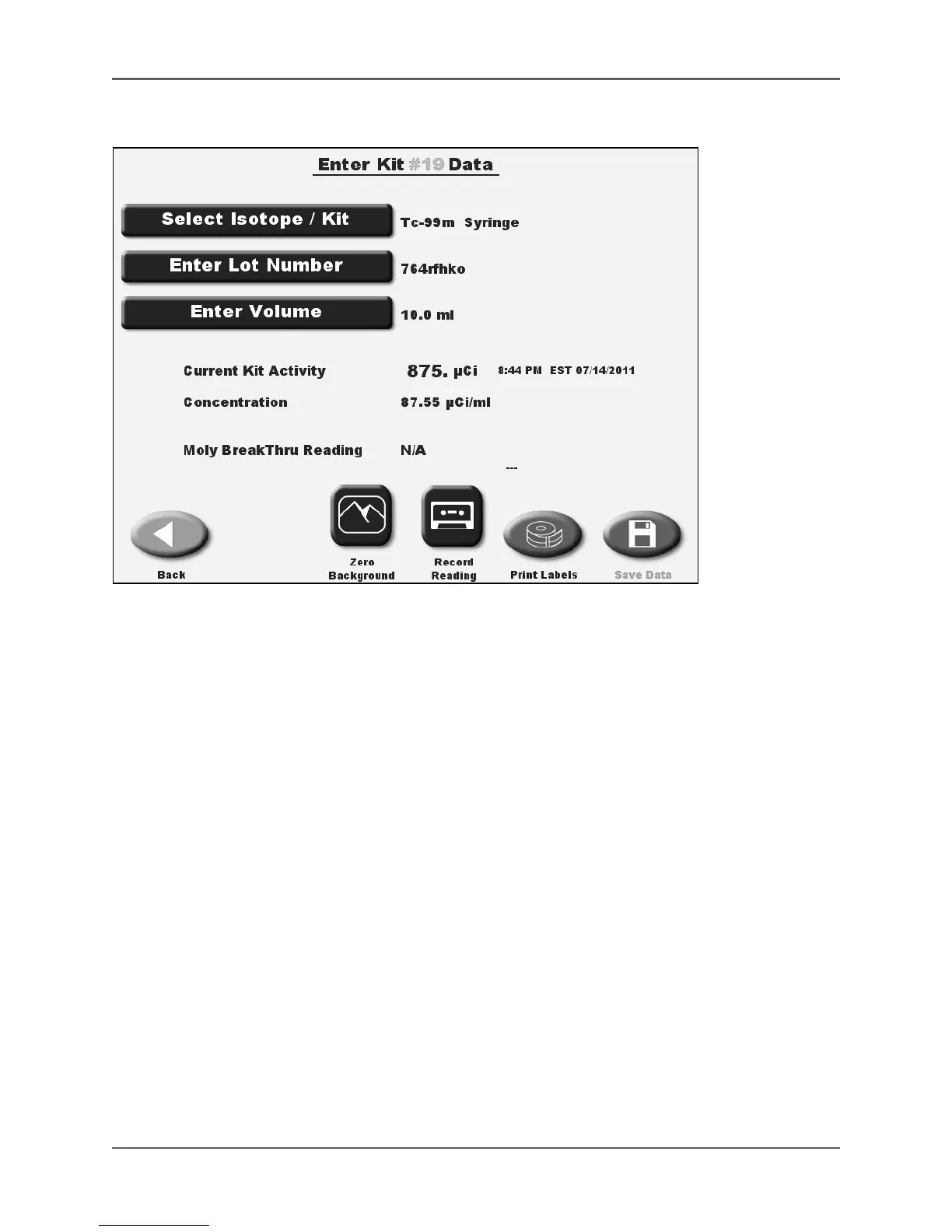 Figure 5.29. The Enter Kit # Data screen results without Moly.