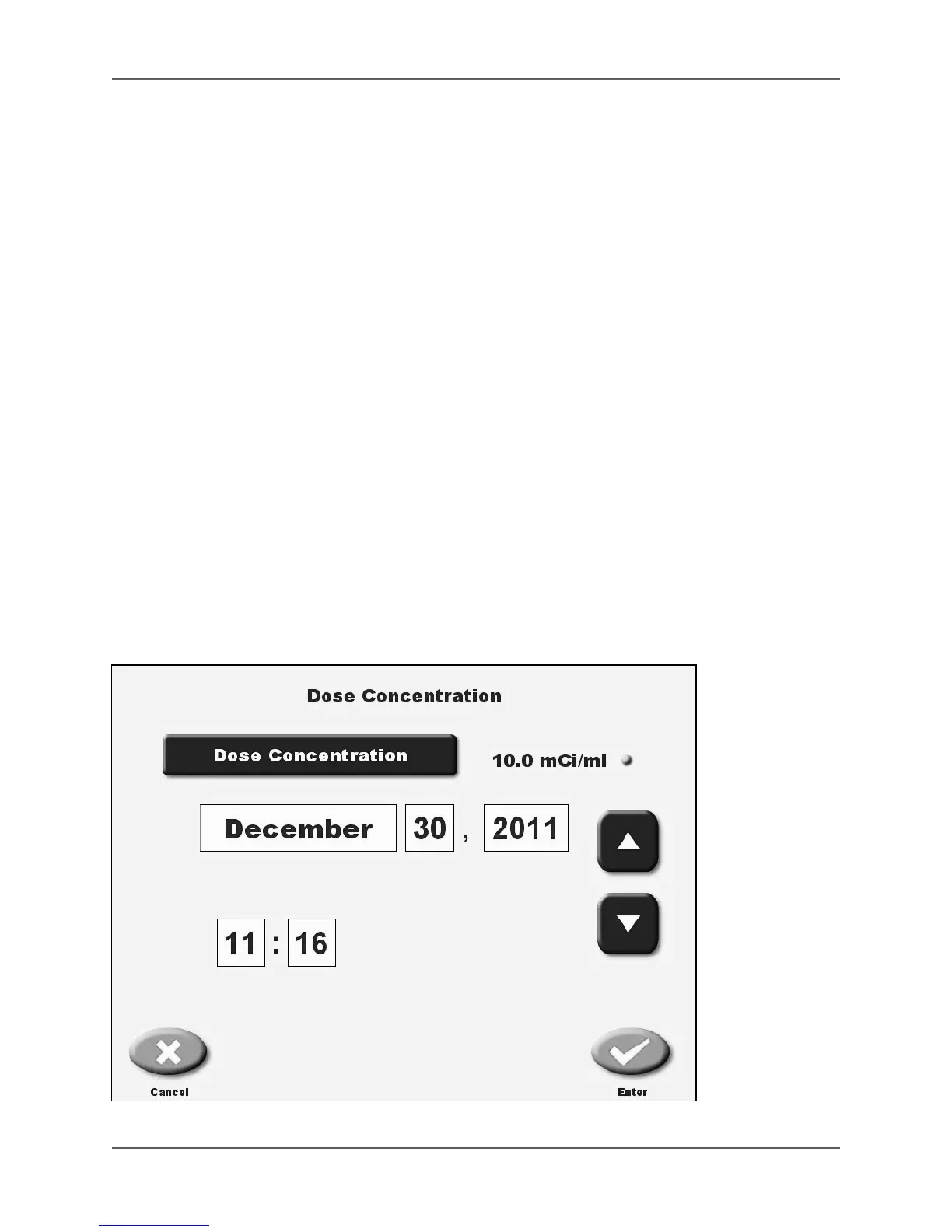7. Touch <Dose Concentration> and enter the activity/ml in the vial. Touch <Enter> to record