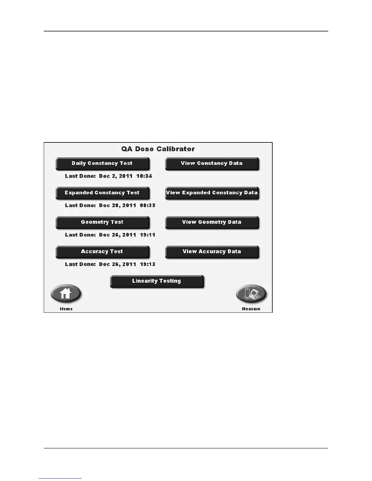 To access the Dose Calibrator Quality Assurance functions, at the Home screen touch <Dose