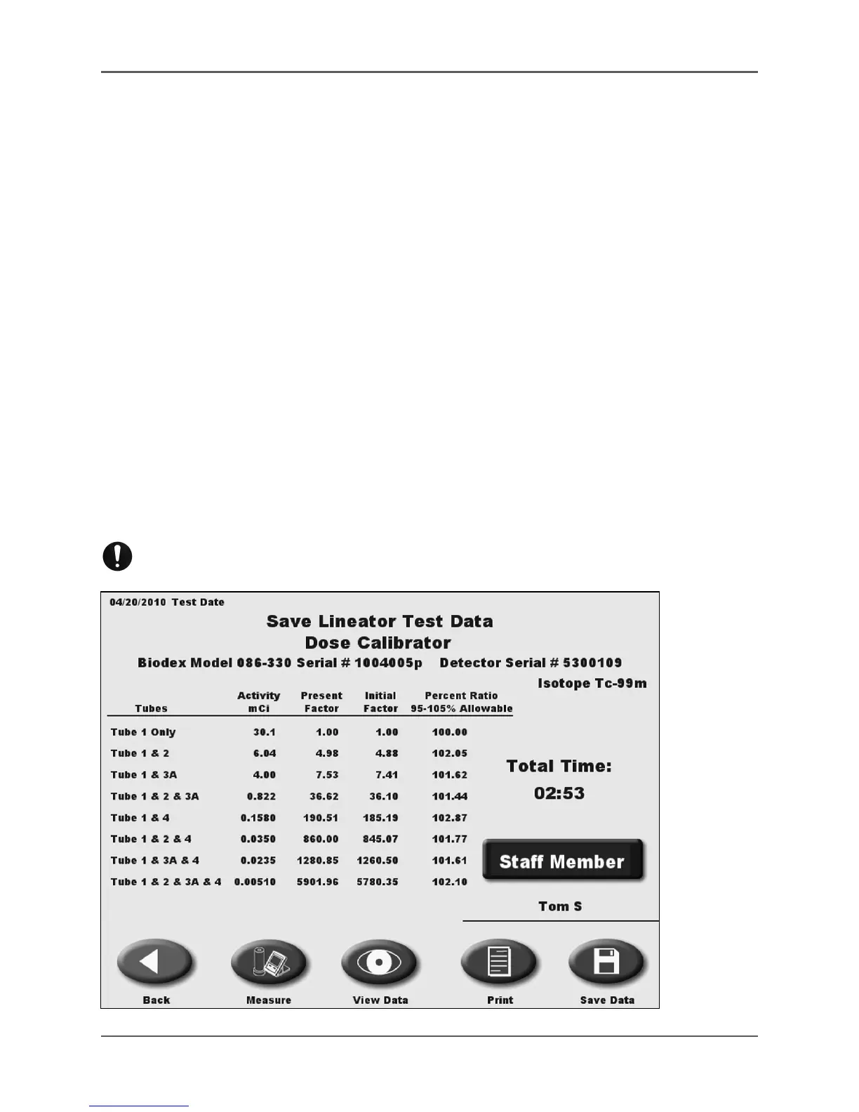 • Touch <View Data> to view the linearity tests stored in the system.