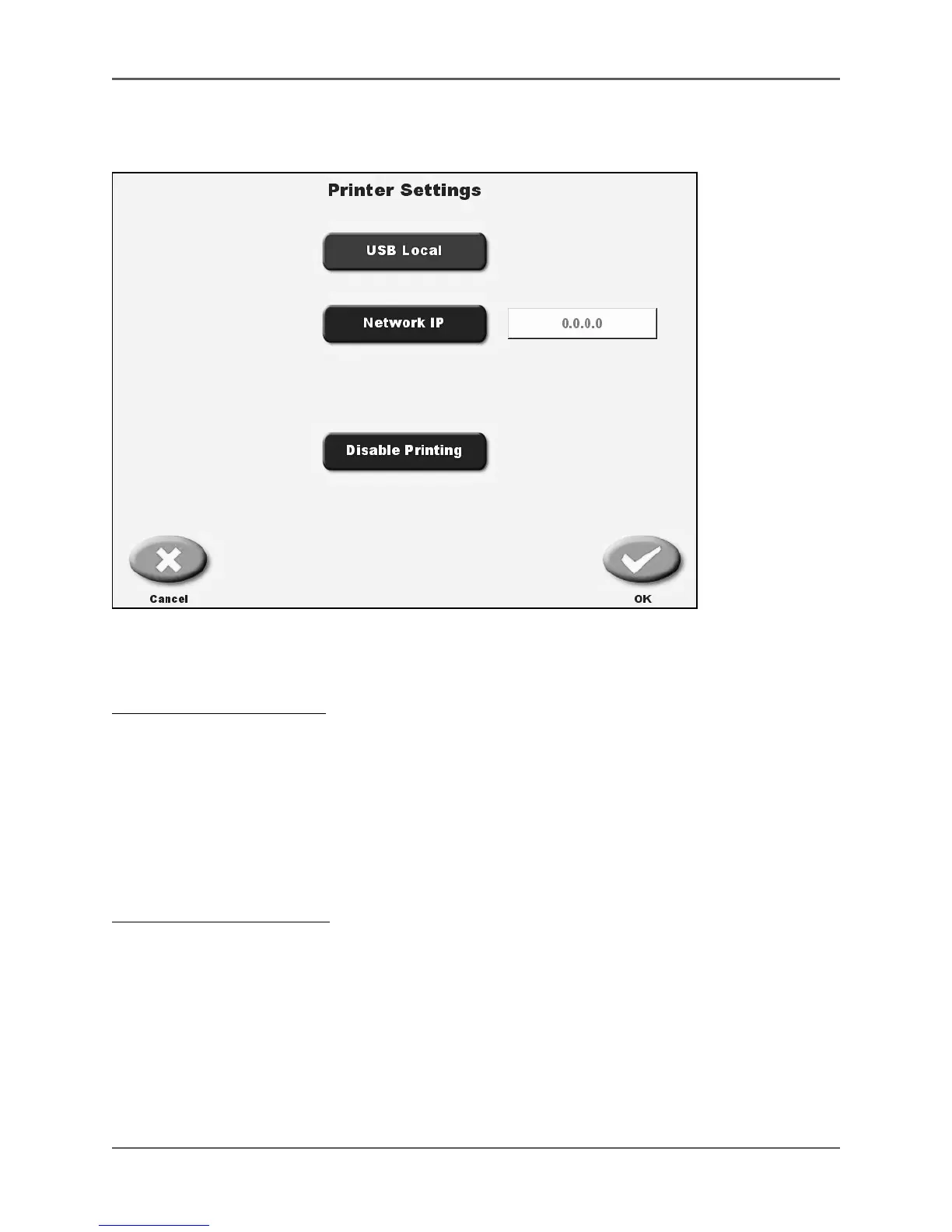 Printer settings can be set to allow for a USB local printer, network IP address, or to disable printing.