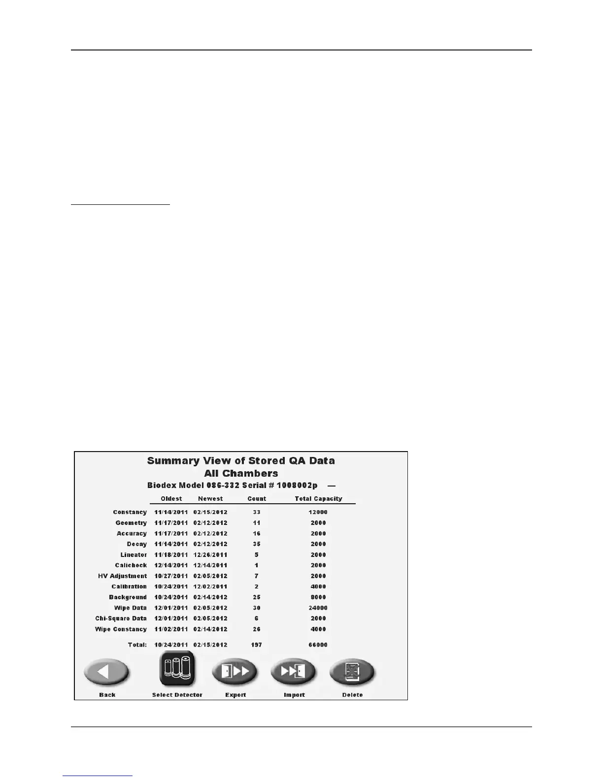 2. Touch <QA Data Management>. The summary view of Stored QA Data screen is now dis-