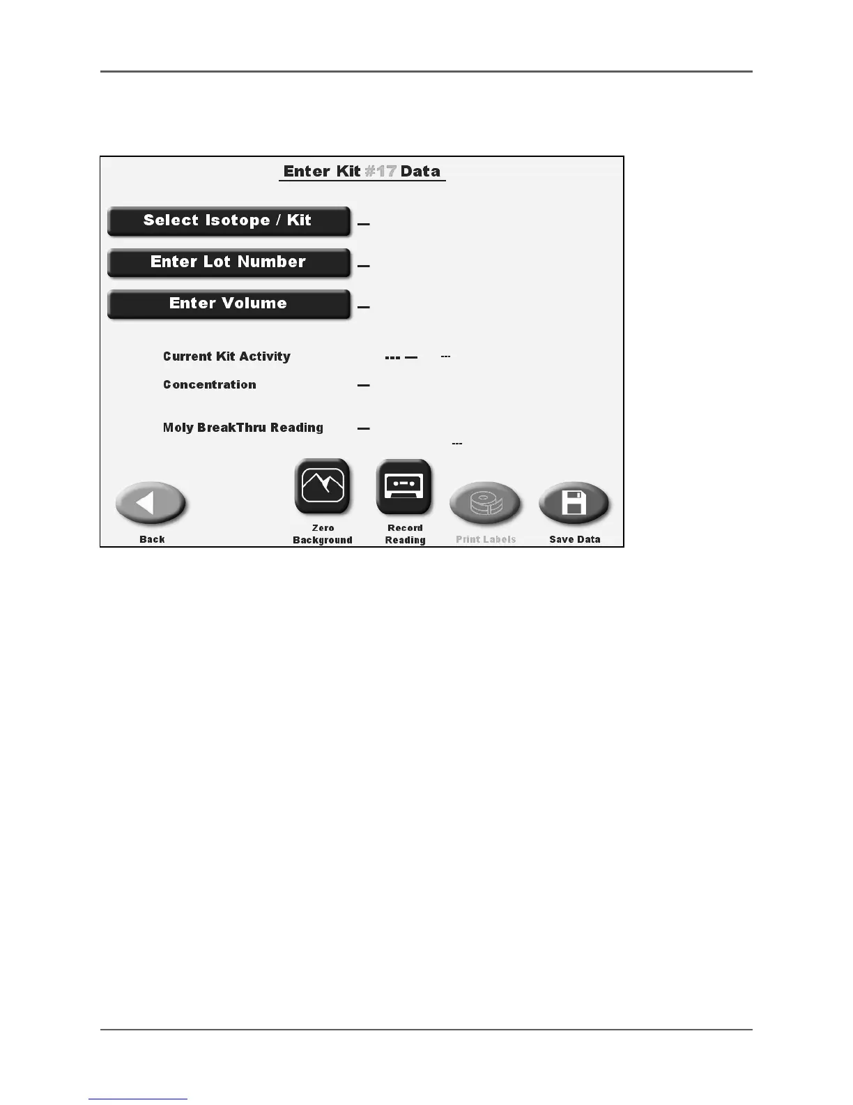 3. Touch <Enter> to return to the Enter Kit # Data screen with the new isotope and/or kit selected.